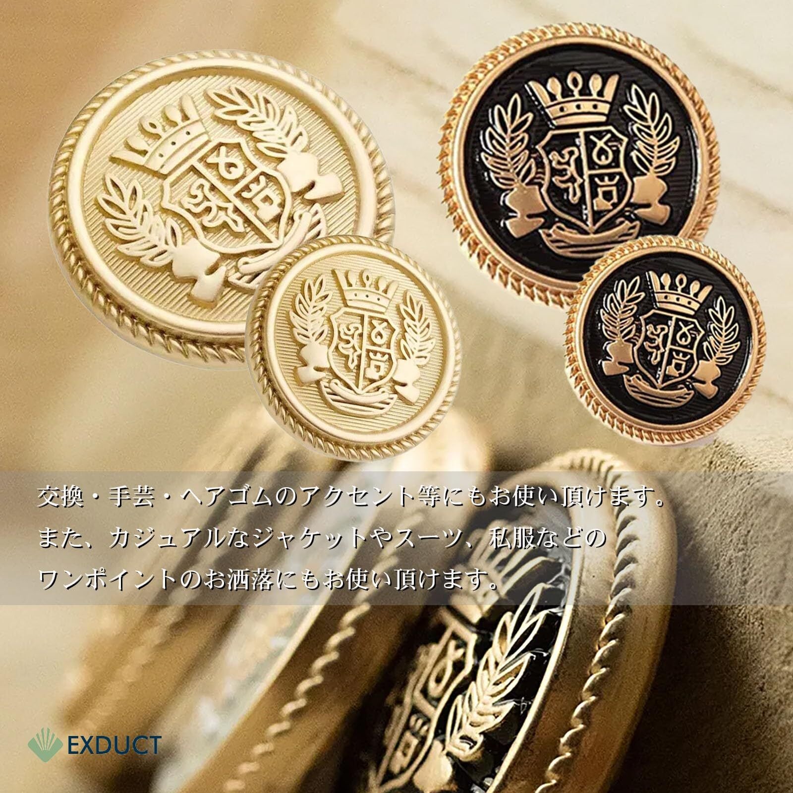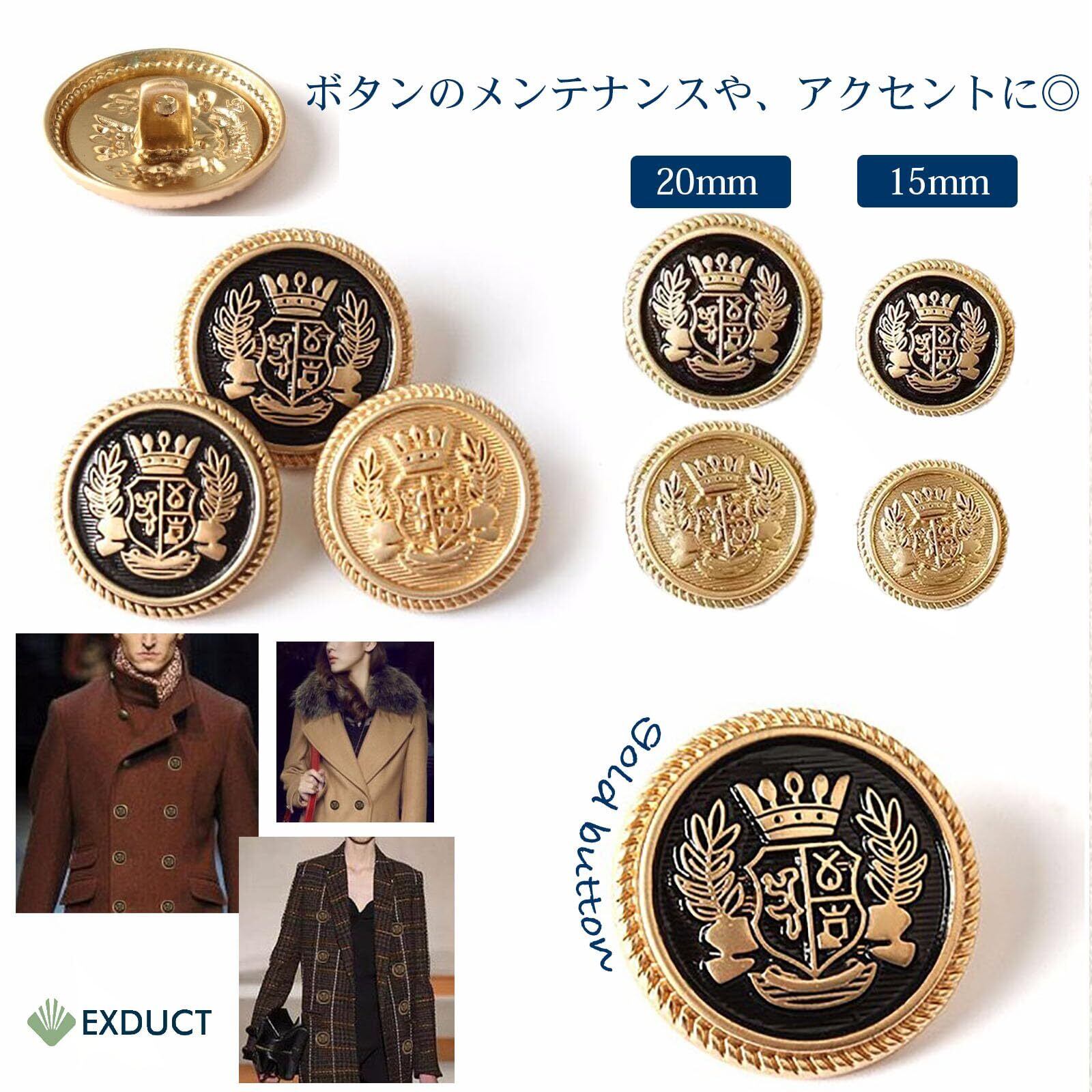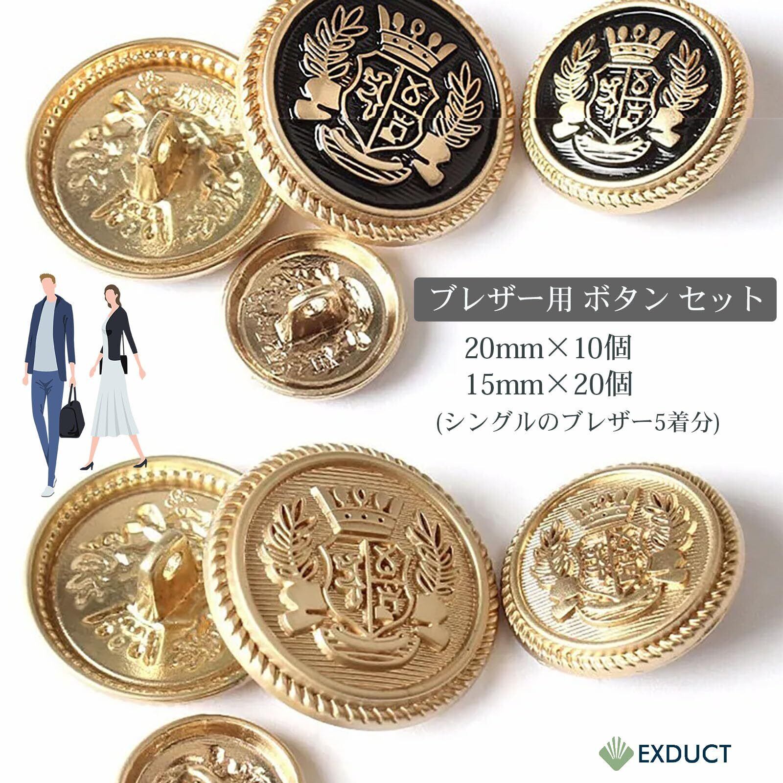 EXDUCT ブレザー スーツ 手芸 ボタン 前ボタン 20mm 10個 袖ボタン 15mm 20個 シングル5着分 (ブラック&ゴールド)