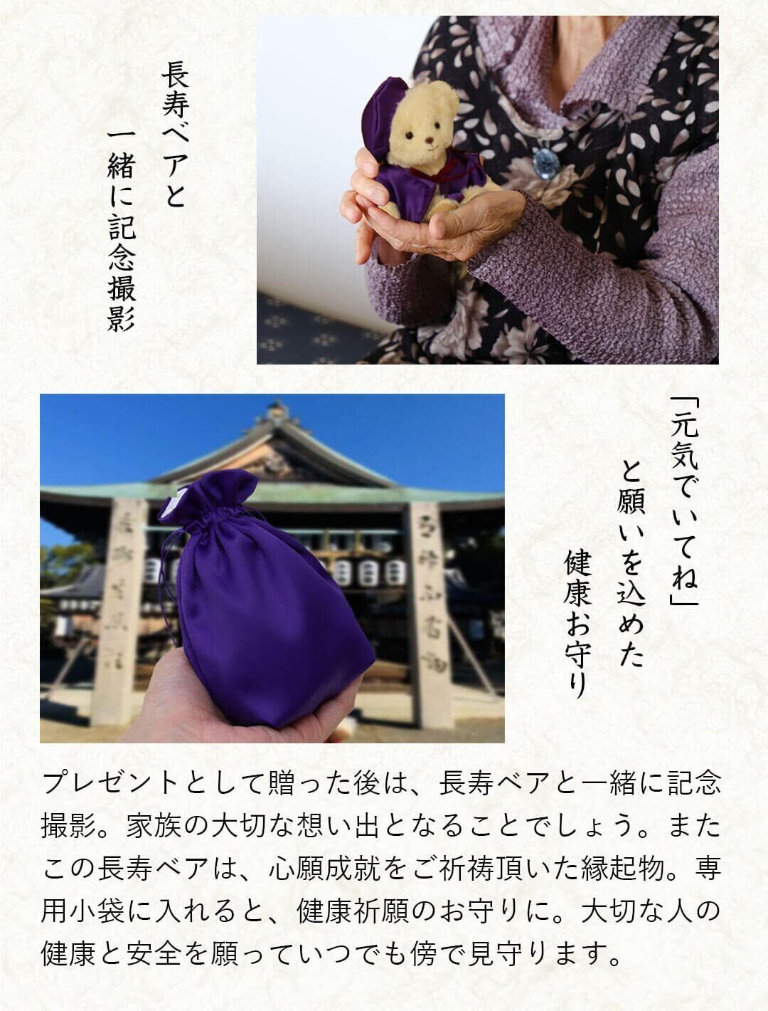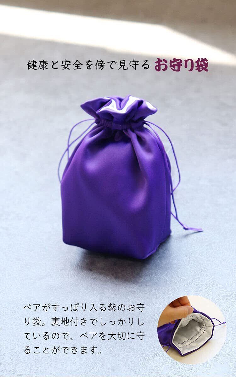 ちゃんちゃんこを着るのは恥ずかしい方もこれで安心! 「代わりにちゃんちゃんこをテディべアに着てもらったよ!」 かわいい表情のテディベア。 紫ちゃんちゃんこを着てちょこんとお座り! 玄関などに気兼ねなく飾れるちょうどいいコンパクトサイズなのも魅力のひとつ。このテディベアは心願成就をご祈祷頂いた縁起物。 持ち運びに便利な専用小袋に入れると、御守としていつでも傍で健康と安全を見守ることが出来ます。