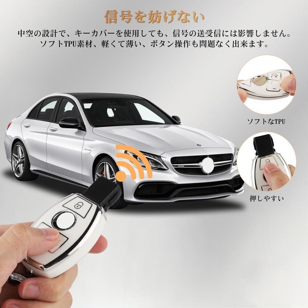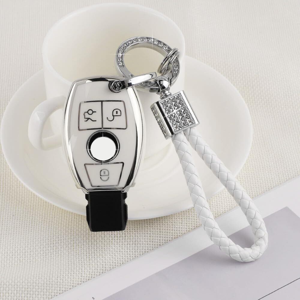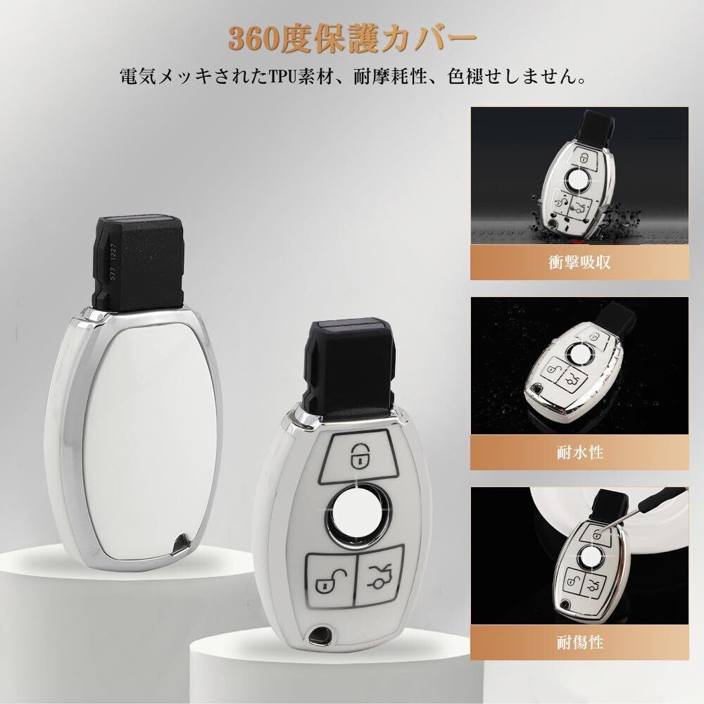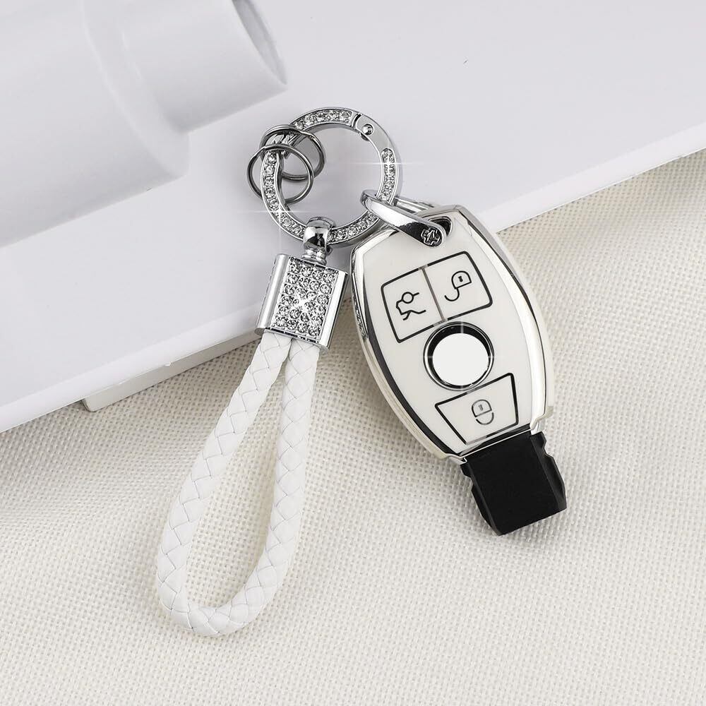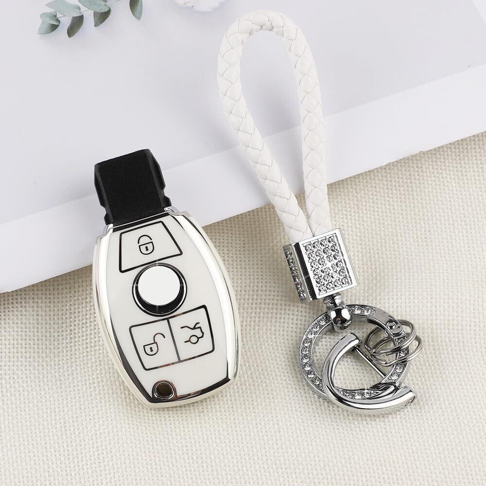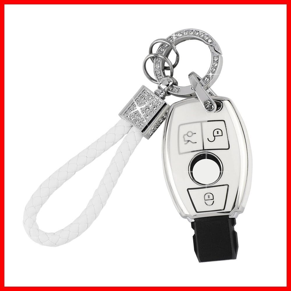 [Catland] ベンツ キーホルダー キーケース 3ボタン メルセデス専用A B C E クラス CLA GLA GLC GLE 鍵 キーカバー スマートキーケース キーチェーン ドレスアップ パーツ アクセサリー 工具付き (ホワイト シルバーエッジ) | hananoki