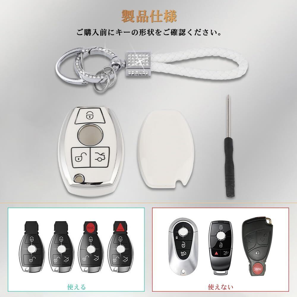 [Catland] ベンツ キーホルダー キーケース 3ボタン メルセデス専用A B C E クラス CLA GLA GLC GLE 鍵 キーカバー スマートキーケース キーチェーン ドレスアップ パーツ アクセサリー 工具付き (ホワイト シルバーエッジ)