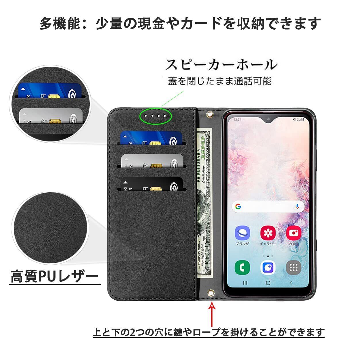 【多機能】: ①[スタンド機能が付いて]:横向いて斜めに立てて、お好きな角度を調整できます。 ②[プラット同梱]:ストラップホール有り、各色合いに専属されるストラップも同梱販売なので、より安全性が高くなるのだけではなく、ストラップとケースの間の相性も存分に考えていおり、ストラップが取り外し可能、実用性満点の組合せとなります。 ③[マグネット開閉式]:携帯ケースの左側の裏に内蔵があり、両面カバーをしっかり固定することができます。 ④[カードポケット付き]内側に3つカードポケット、車券と名刺などに便利なカードスロット、小銭など挿入可能サイドポケット、ちょっとしたお出かけにもこれ一つでOK!財布型ケースとして、名刺やお札などを入れるカードポケットがつき、日常生活に便利です。