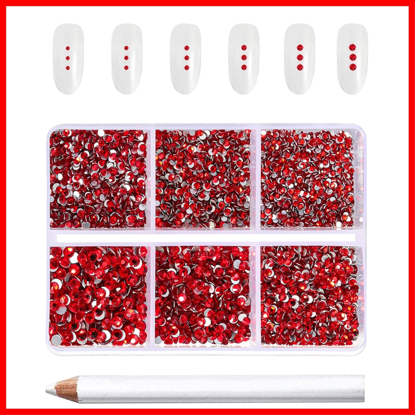 1箱パック、6サイズ計7,200個のライトレッドネイルラインストーン入り、小さなラインストーンピッキングペン付き。メイン写真のアクリルネイルは含まれていません。小さいサイズのネイルラインストーンを見せるために使われているだけです。