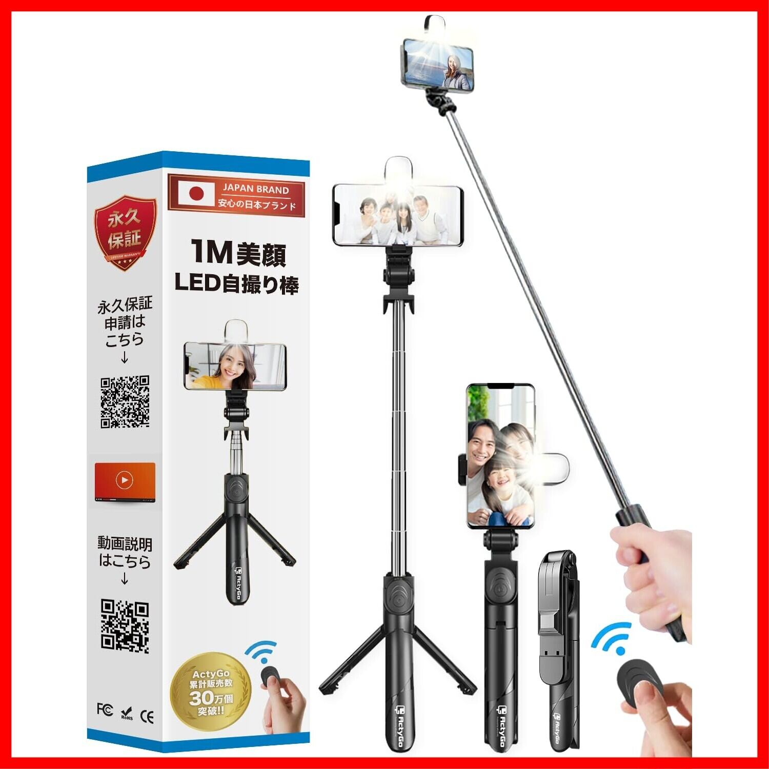 【日本のカメラ専門会社が開発】ActyGo LEDライト付き自撮り棒 100cm 7段階伸縮 三脚一脚兼用 bluetoothリモコン 360°回転 iphone android対応 (ブラック)