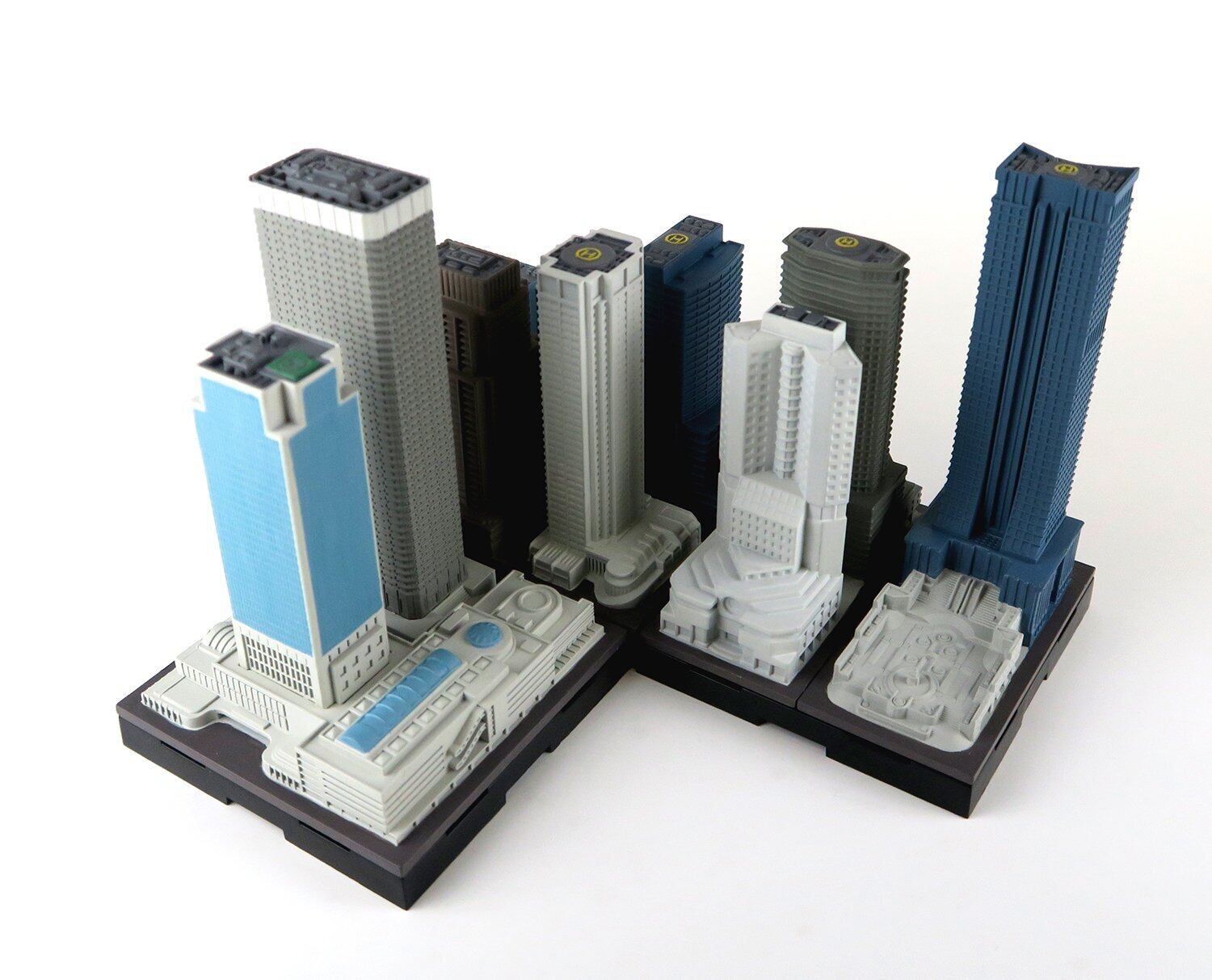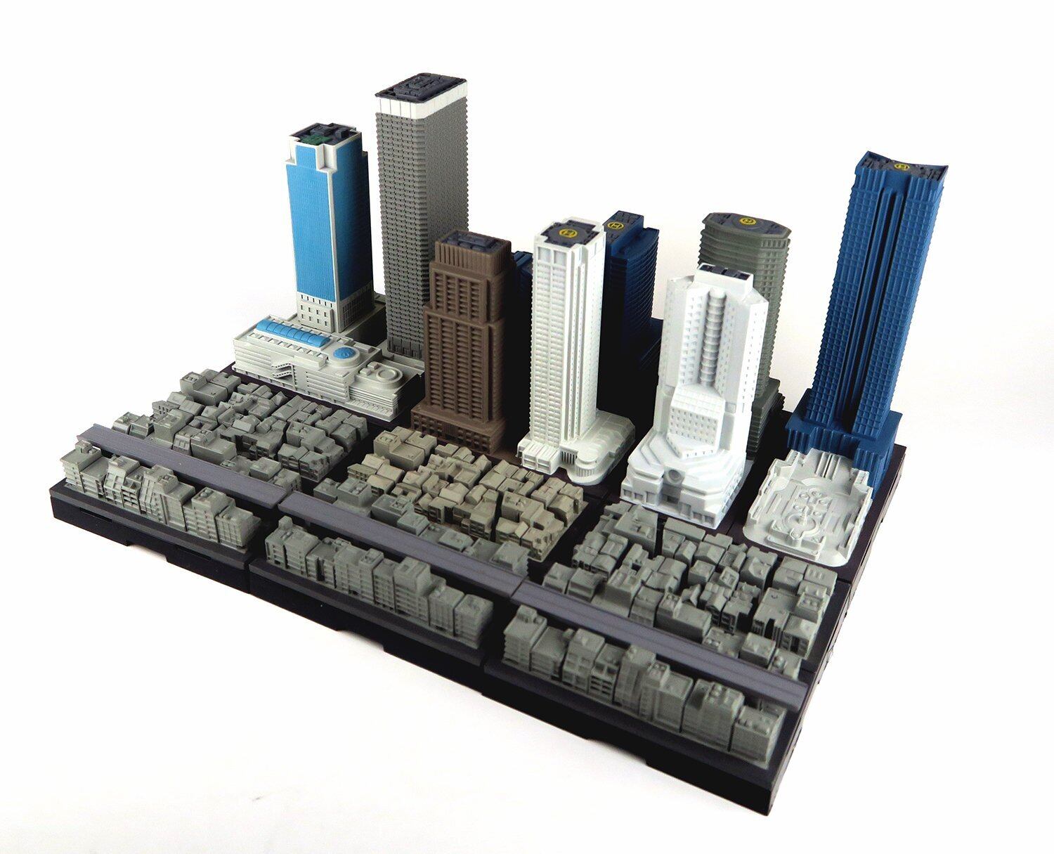 「集める、広がる、街ができる。」をコンセプトに 1/2500 スケールで様々な建築物を立体化し、6cm角の台座に自由に配置し連結させることで「都市開発」を楽しめる商品が「ジオクレイパー」です。