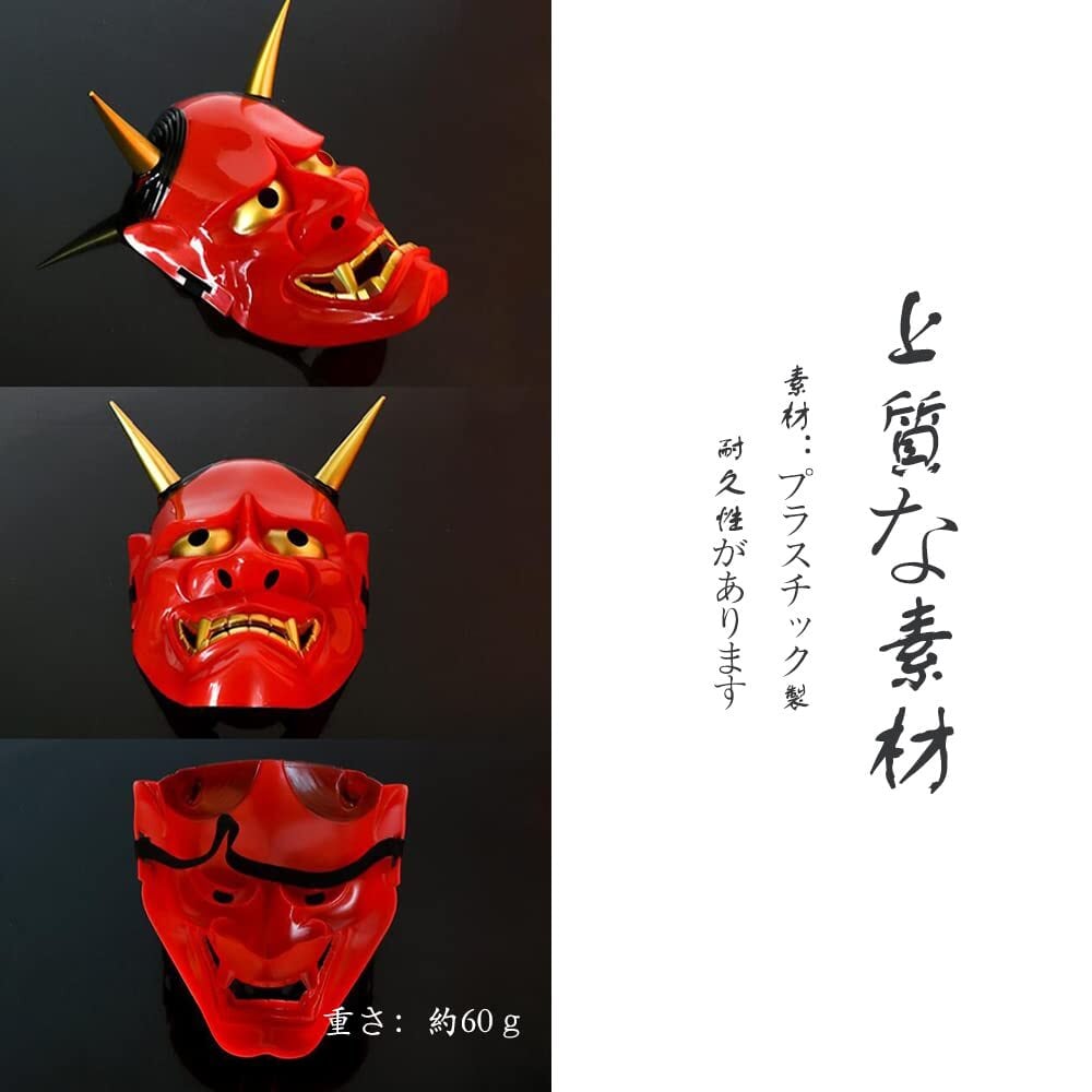 4.特徴:立体的な金色の角と迫力あるリアルで怖い表情のオニお面(はんにゃ面)。