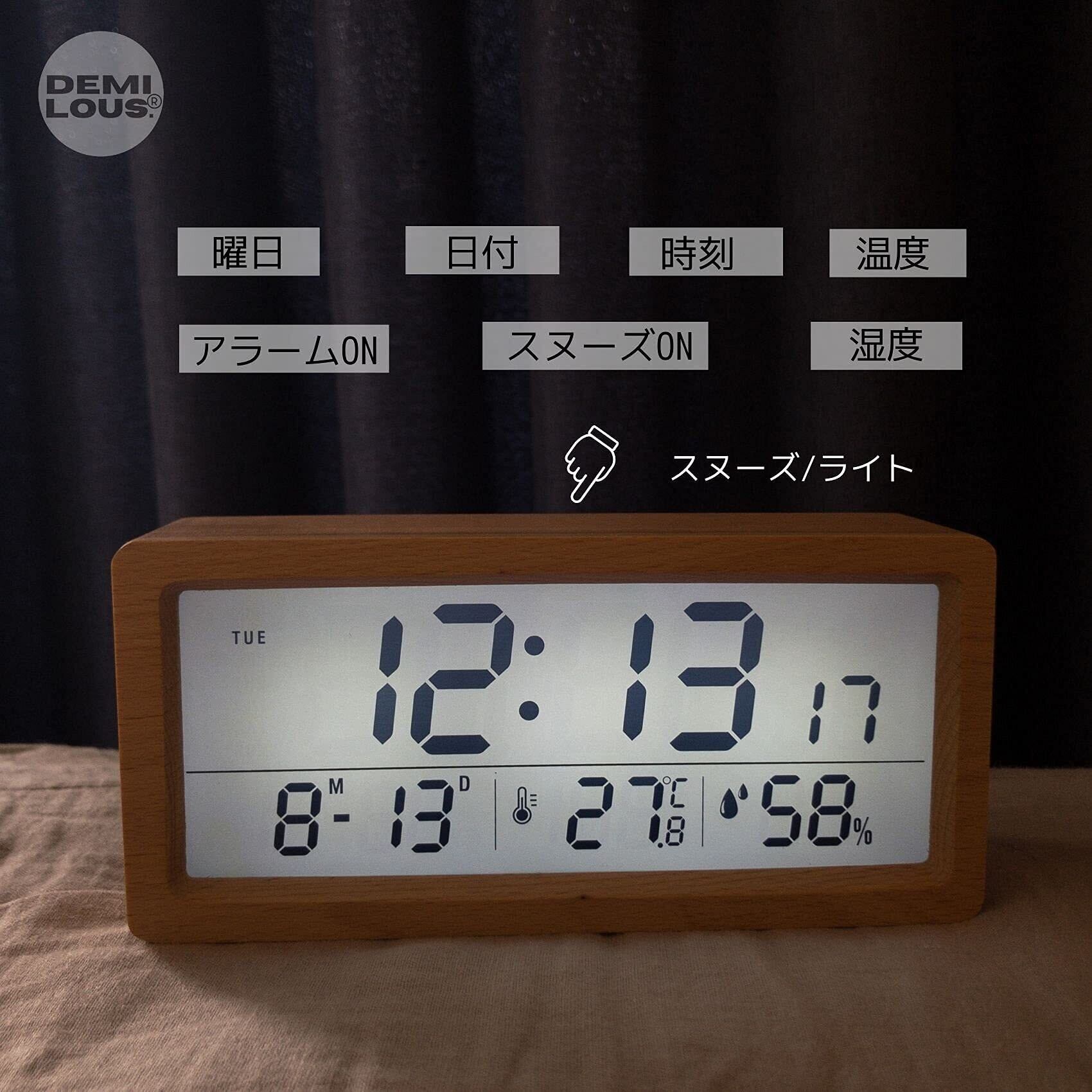 【天然木使用】天然木を使用した高級感ある外観な置き時計です。デジタル表示も見やすくリビング、寝室でも見やすい表示となっています。アラーム設定も簡単でスヌーズ機能もあり安心です。おしゃれな時計なのでプレゼントにも最適です。どこにでも置きやすいサイズなので寝室だけでなくワーキングデスク、子供部屋にも使えます。