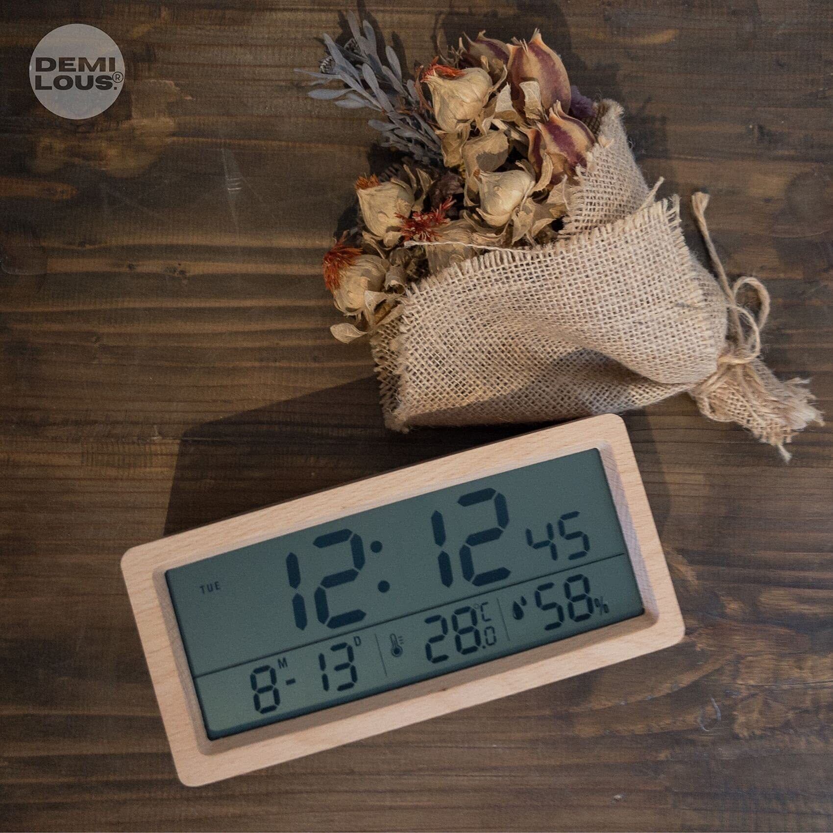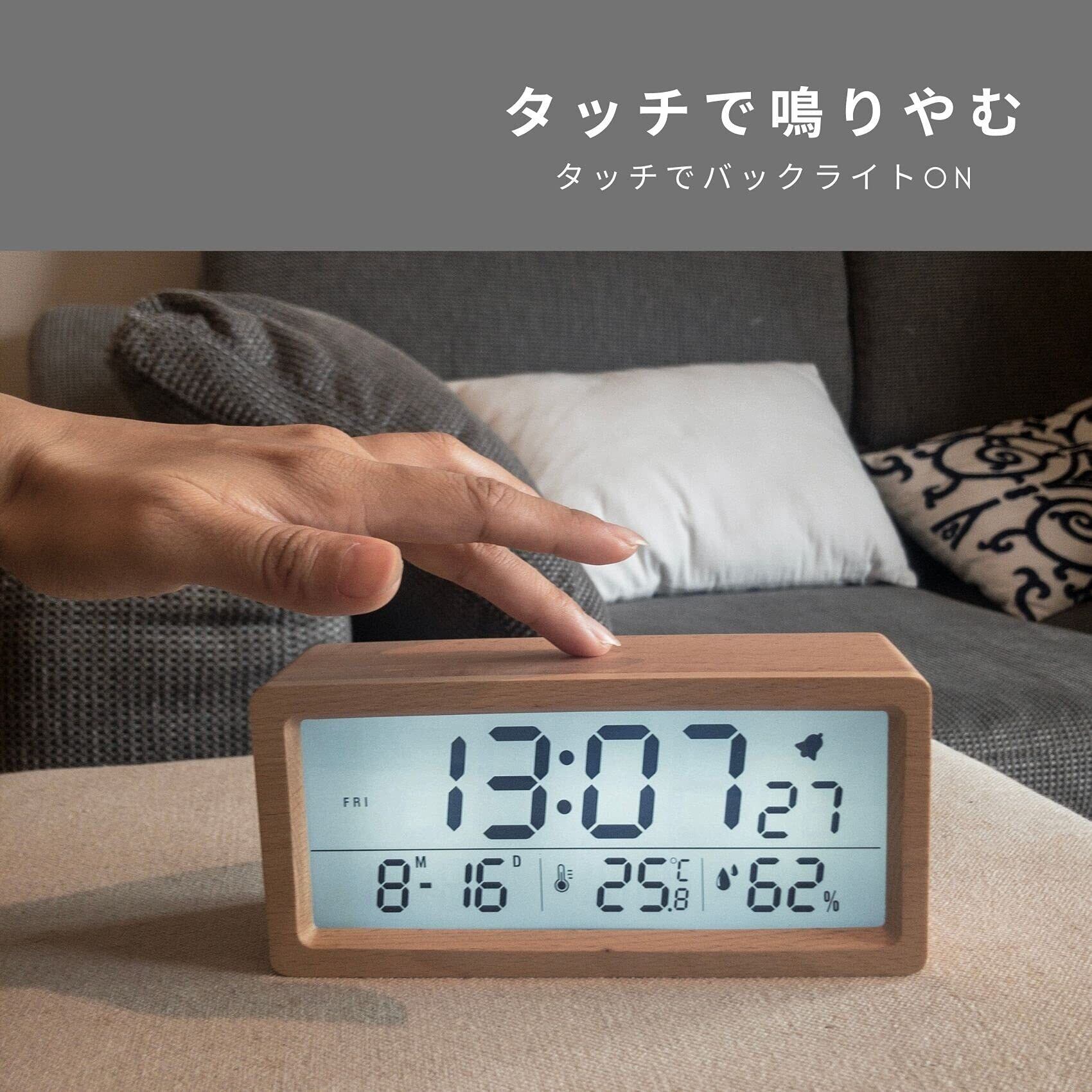 デジタル 置き時計 目覚まし時計 カレンダー 電池式 おしゃれ 天然木製 温度 湿度 表示付き アラーム時計 インテリア 置時計 リビング 寝室 ベッドサイド 叩くだけでアラームが止まる 持ち運べる (けやきベージュ) | hananoki
