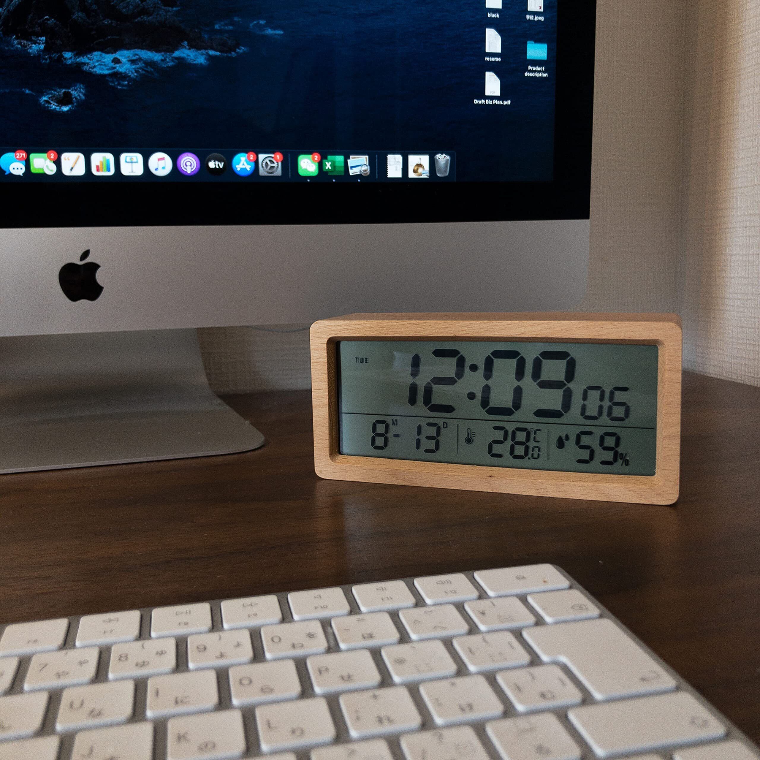 デジタル 置き時計 目覚まし時計 カレンダー 電池式 おしゃれ 天然木製 温度 湿度 表示付き アラーム時計 インテリア 置時計 リビング 寝室 ベッドサイド 叩くだけでアラームが止まる 持ち運べる (けやきベージュ)