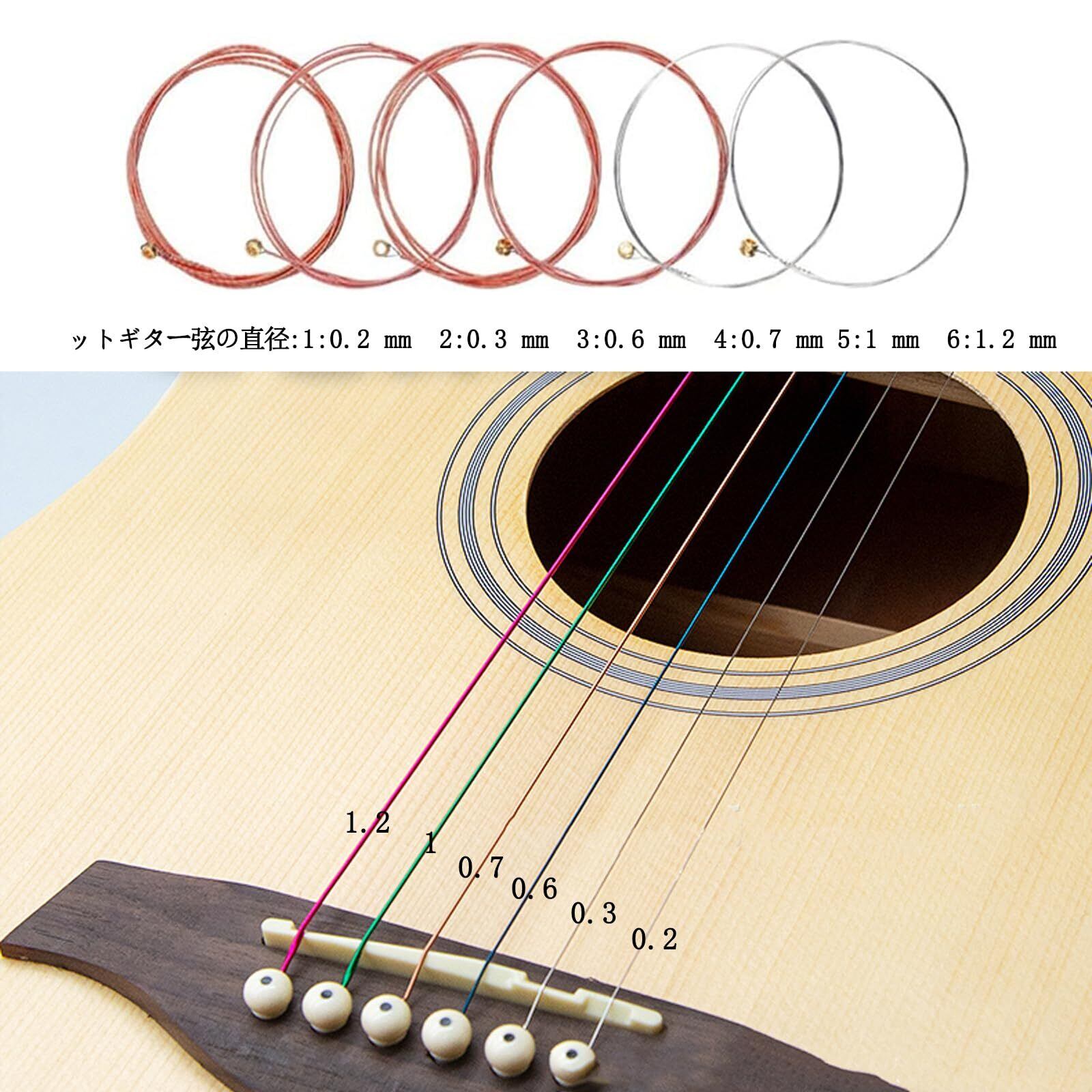 【ットギター弦の直径】:1:0.2 mm ; 2:0.3 mm ; 3:0.6 mm ; 4:0.7 mm; 5:1 mm ; 6:1.2 mm