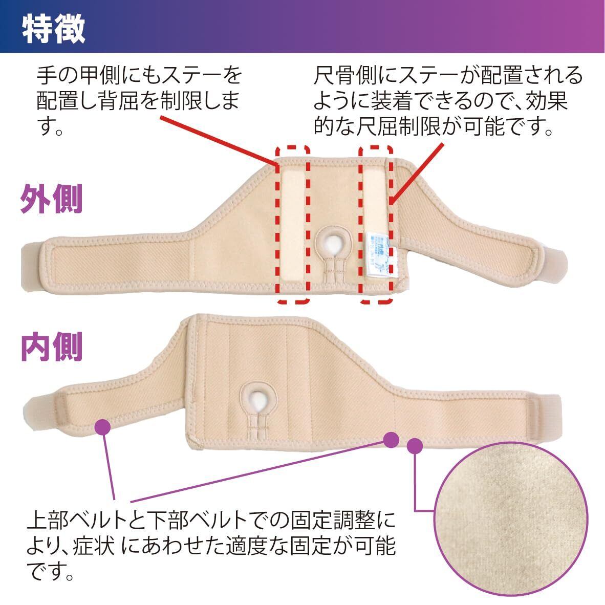 ●使用方法:※この商品は左右兼用です。 (1)肌側、上下をお確かめください。 ・商品タグの付いている方が外側です。 商品の丸穴を尺骨茎状突起(手首小指側の突起している部分)に合わせます。 (2)下部ベルトを接着します。 丸穴の位置がズレないように押さえながら、下部ベルトを手のひら側を通して適度な力で手の甲側に引っぱり、面ファスナーで固定します。(商品タグと丸穴を覆うように接着します。) (3)上部ベルトを接着します。 丸穴の位置がずれないように押さえながら、上部ベルトを手のひら側を通して適度な力で手の甲側に引っぱり、面ファスナーで固定します。 (4)装着状態を確認してください。 丸穴がしっかり突起部分に位置するように、調整してください。