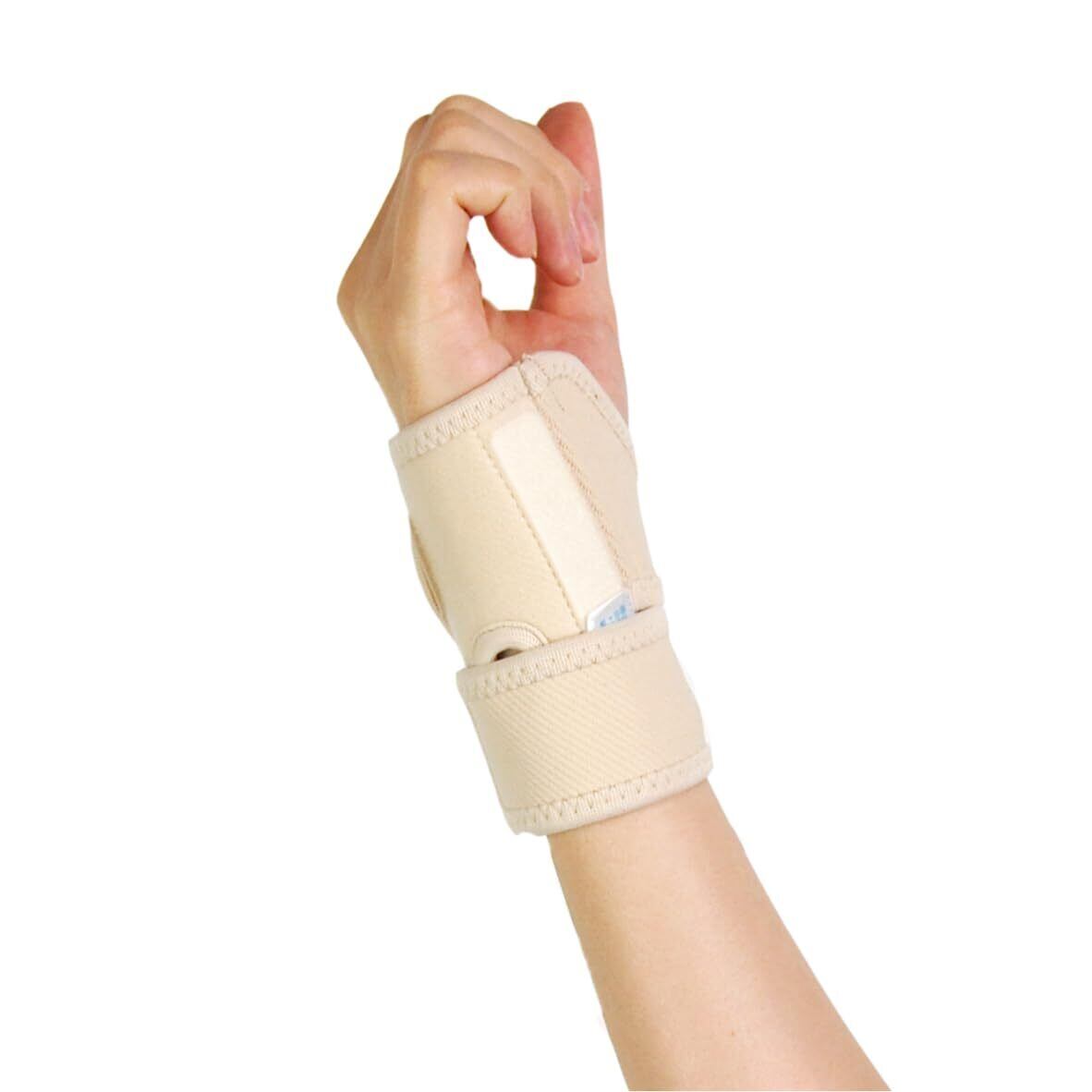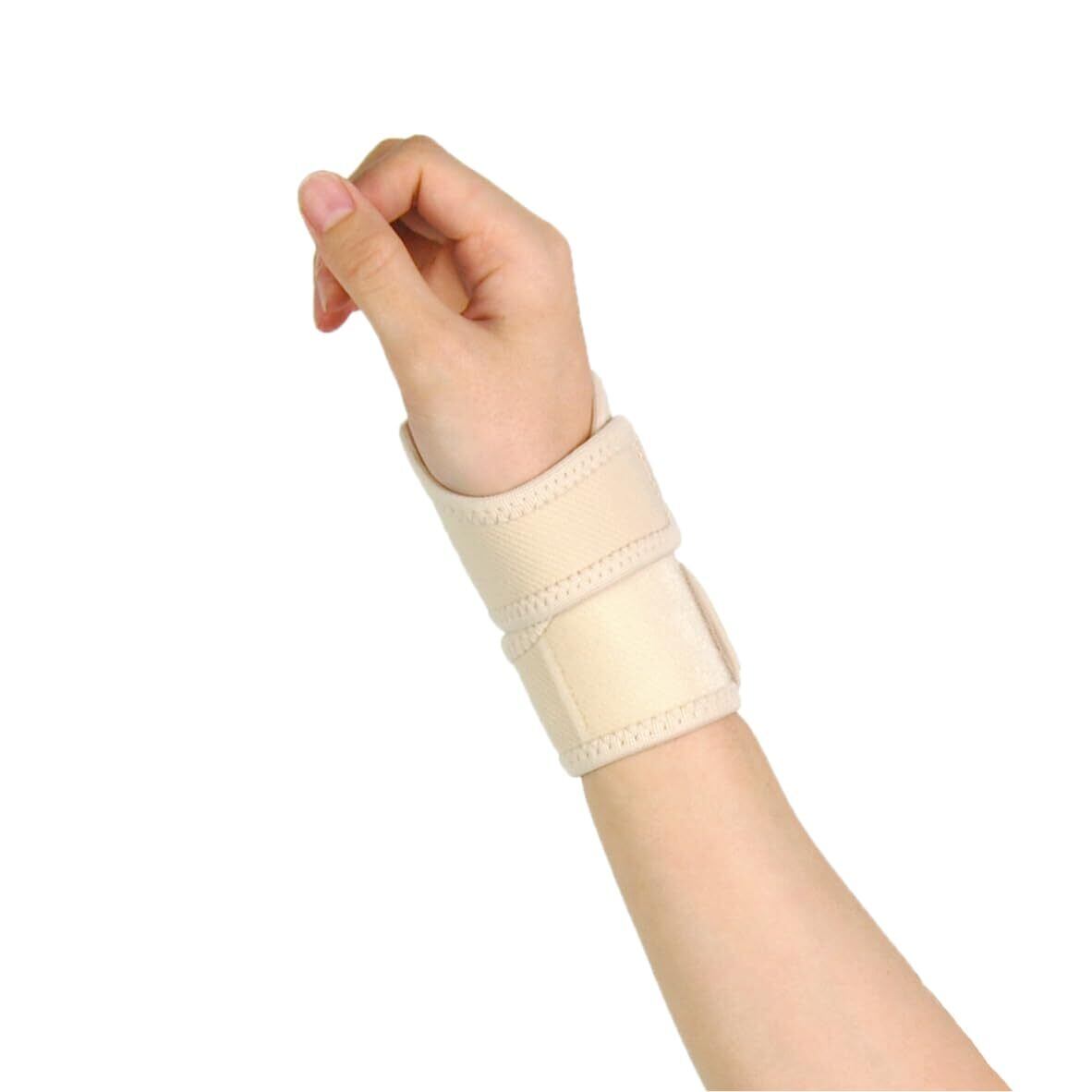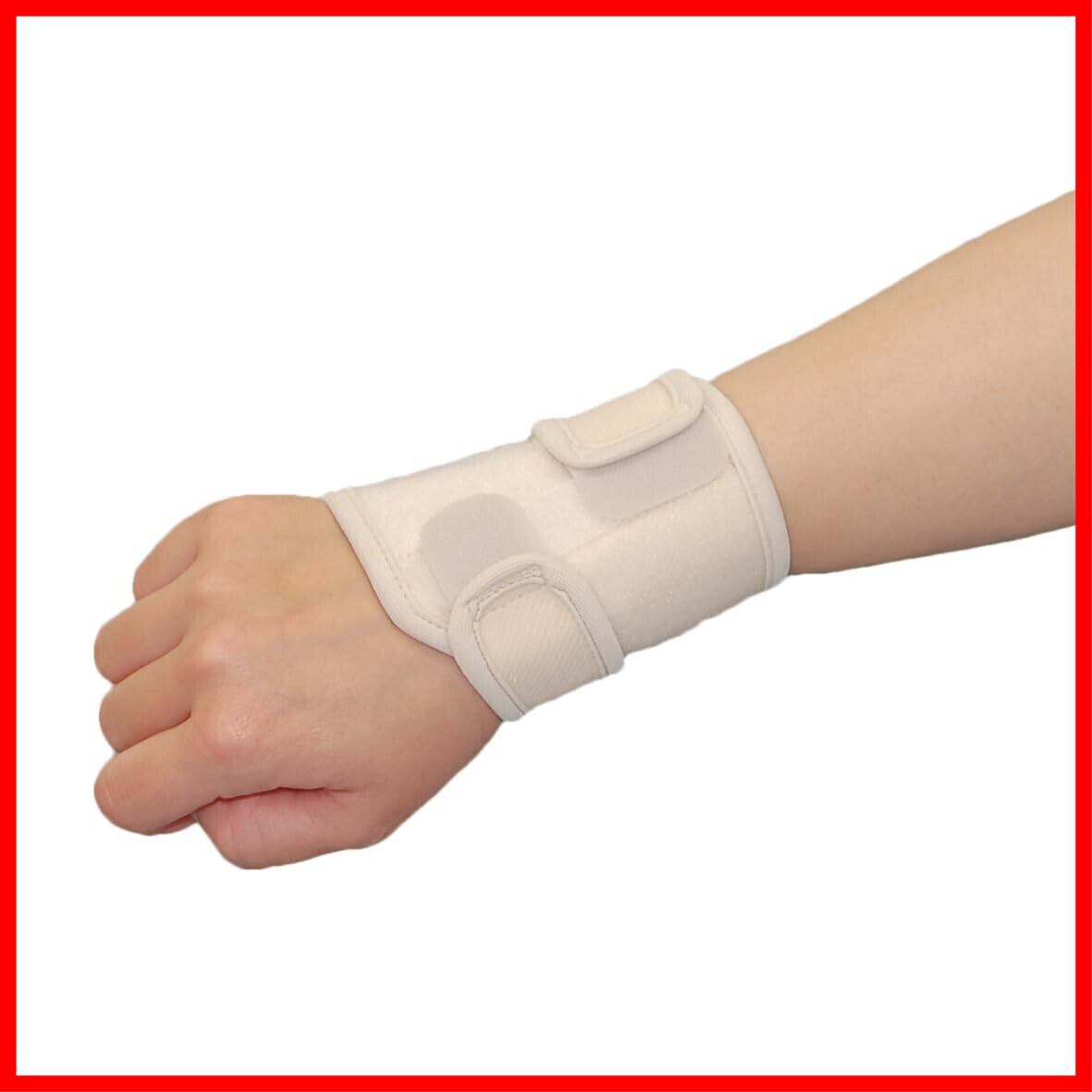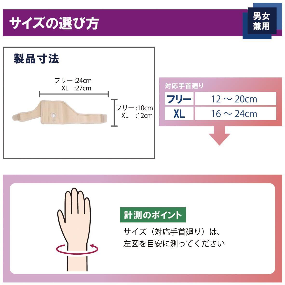 【手首廻り】 12-20cm 【幅】 10cm 【カラー】 ベージュ 【使用方法】 ※この商品は左右兼用です。 (1)肌側、上下をお確かめください。 ・商品タグの付いている方が外側です。 商品の丸穴を尺骨茎状突起(手首小指側の突起している部分)に合わせます。 (2)下部ベルトを接着します。 丸穴の位置がズレないように押さえながら、下部ベルトを手のひら側を通して適度な力で手の甲側に引っぱり、面ファスナーで固定します。(商品タグと丸穴を覆うように接着します。) (3)上部ベルトを接着します。 丸穴の位置がずれないように押さえながら、上部ベルトを手のひら側を通して適度な力で手の甲側に引っぱり、面ファスナーで固定します。 (4)装着状態を確認してください。 丸穴がしっかり突起部分に位置するように、調整してください。