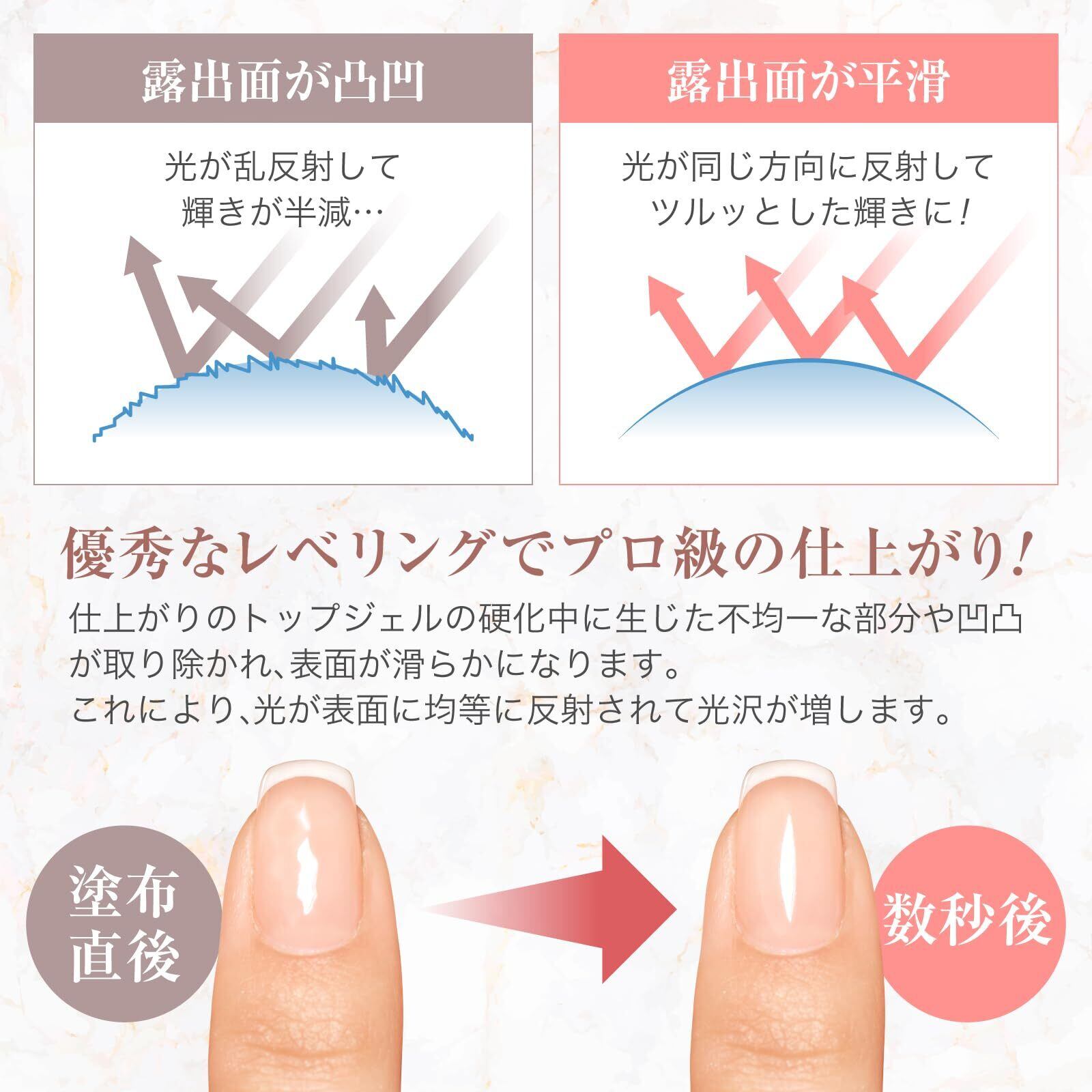 曇りもないからアートやカラーが映えるクリア感に仕上がり満足度MAX 美しい艶はもちろんトップジェル塗りたてのクリア感が長期間持続します!