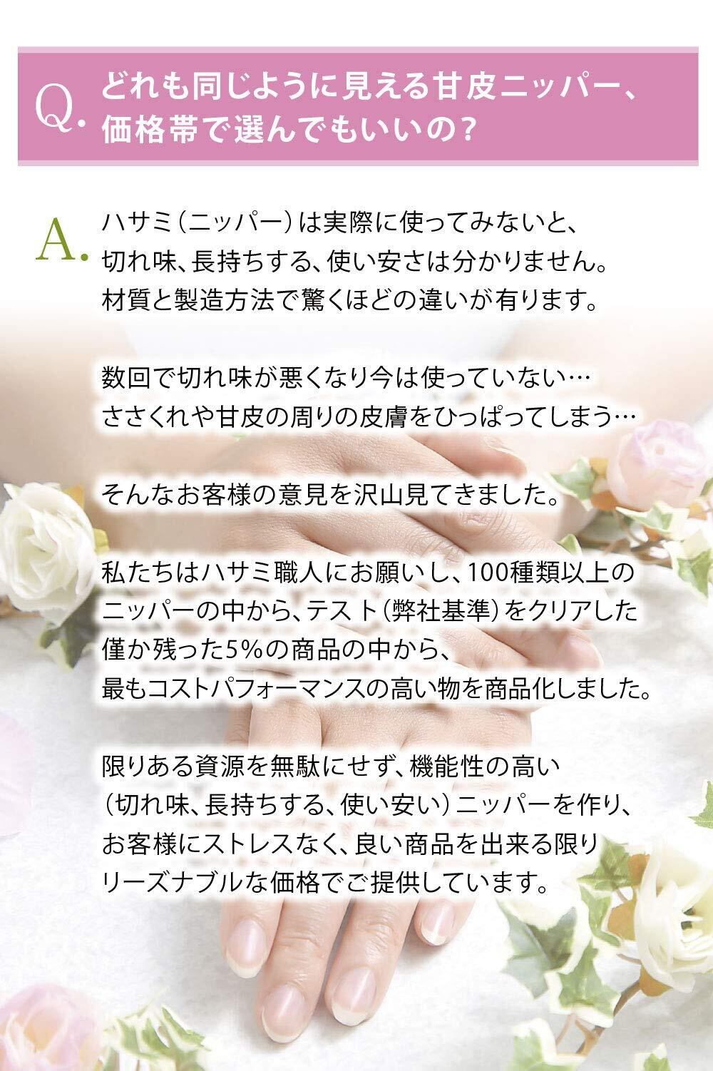 「 甘皮ニッパー 」は理美容専門のハサミ職人に監修頂きました。見た目どれも同じように見えるニッパーですが、使ってみればその差は一目瞭然。本当に良いものはストレスフリーな使い心地です。La SACHIの 甘皮ニッパー は滑らかなダブルスプリングのハンドル、左右の手ともに持ち易いよう長めの設計、厳しいテストにパスした切れ味、更に刃先を1.5mmの噛み合わせにすることで、余計な皮膚をひっぱったり、切り落とすことなく、細い甘皮やささくれを狙った箇所だけスパッと切り落とせます。