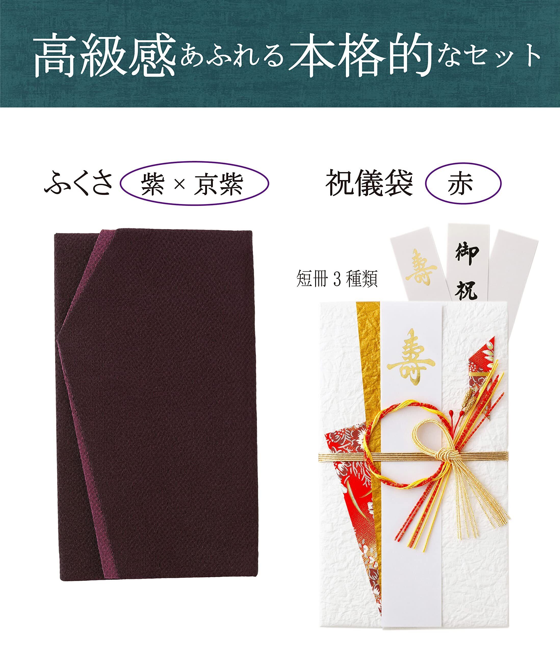 珠音 ふくさ 祝儀袋 セット 慶弔 両用 紫 黒 金封 ちりめん 袱紗 男性 女性 結婚式 香典 日本製 (紫+赤祝儀袋)