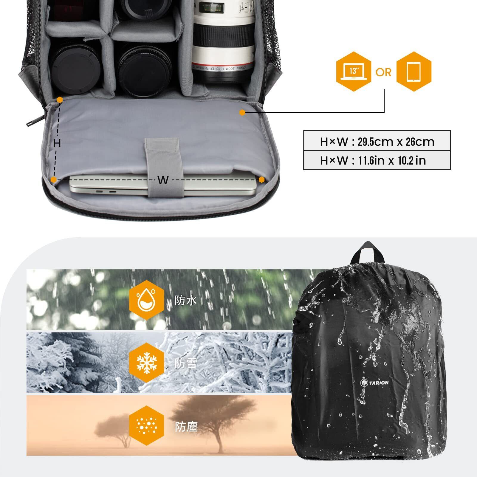 [TARION] カメラバッグ 軽量 コンパクト 十分な容量 三脚収納 カメラバックパック レインカバー付き カメラリュック カメラ バッグ リュック カメラケース 一眼レフカメラ ドローン用 撮影用バッグ 日常用バッグ ブラック TBS