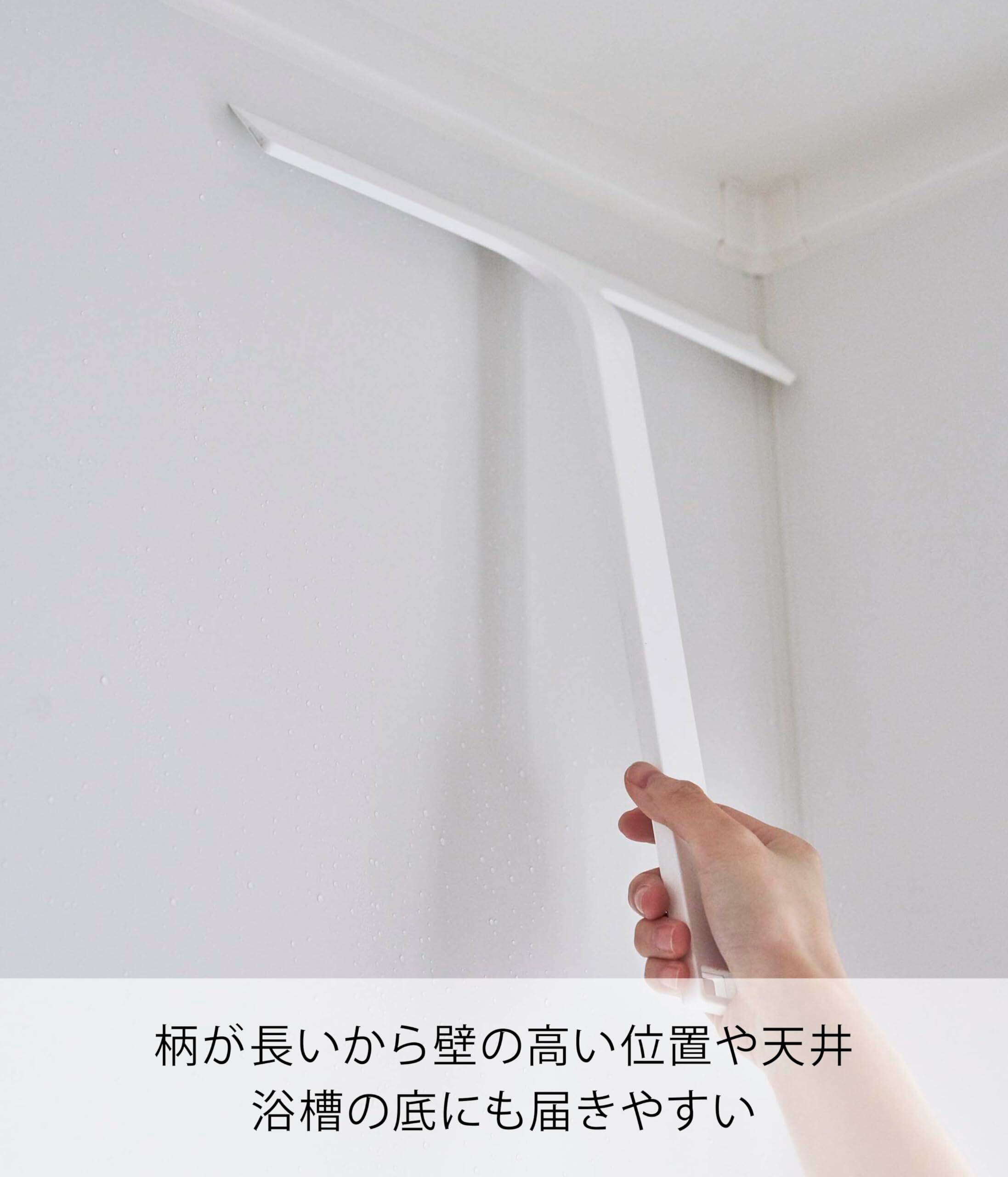 ワイパー部分がワイドだから30cmまでの鏡の水切りも1度でスッキリ! 柄が長いから浴槽の底や天井、壁の高い位置にも使えます。