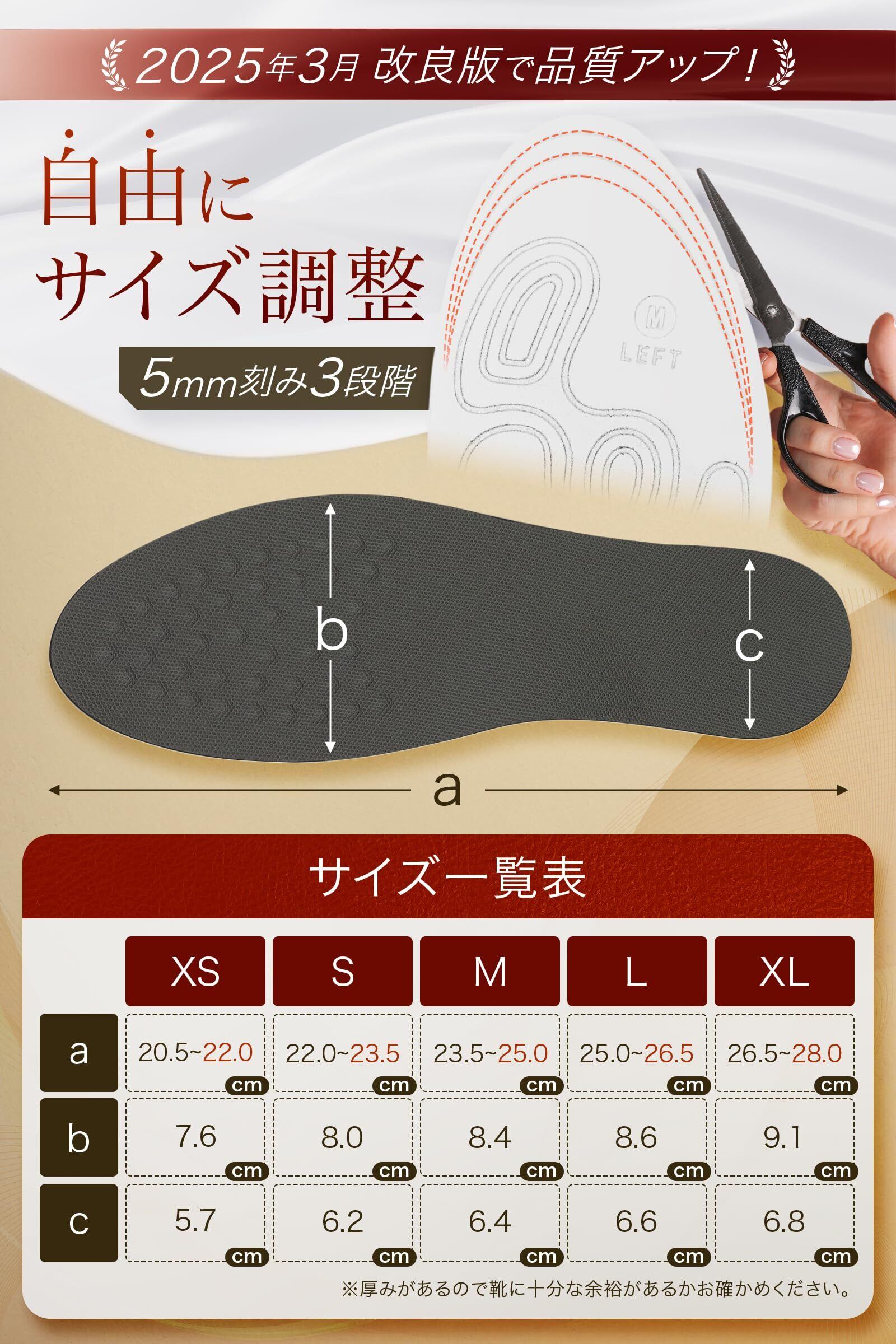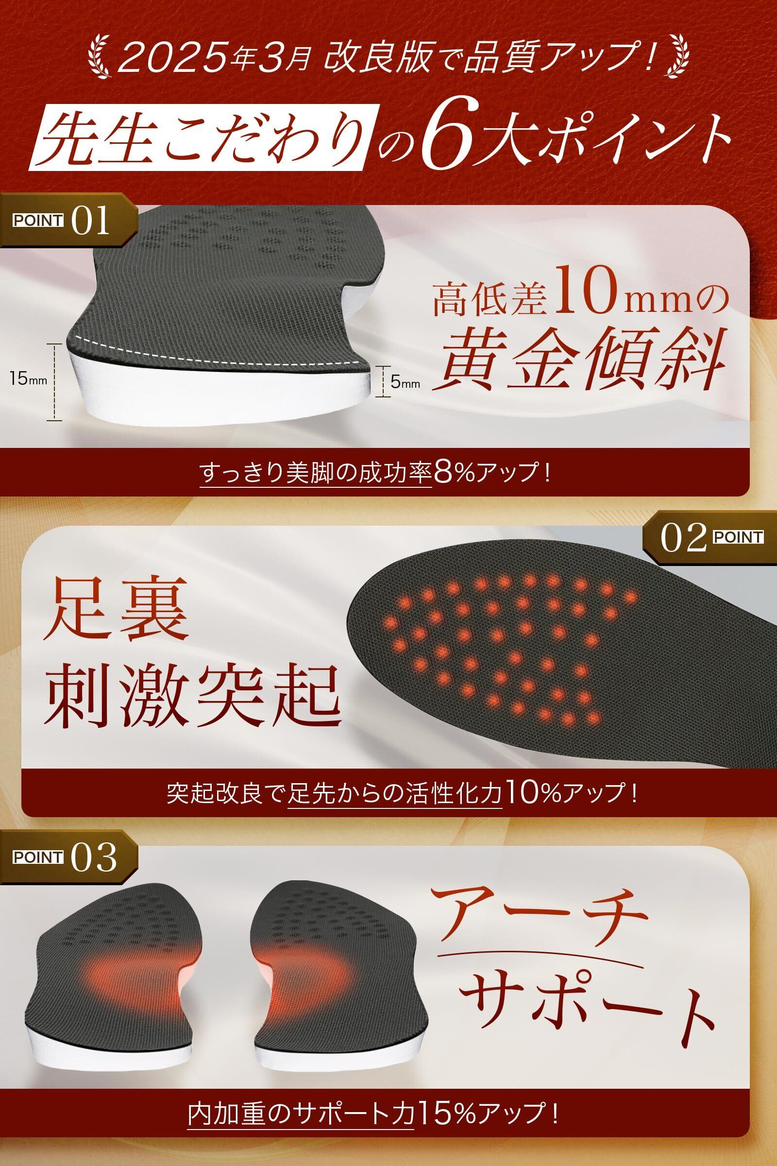 【改良版】入れるだけで真っすぐ脚に!お客様の声を元に、①高低差10mmですっきり美脚成功率8%UP、②足裏刺激突起で足先活性化力10%UP、③アーチサポートのサポート力15%UP、④軽量設計で重量10%DOWN、⑤清潔設計で快適性15%UP、⑥耐久設計で耐久性10%UP、に大改良しました。