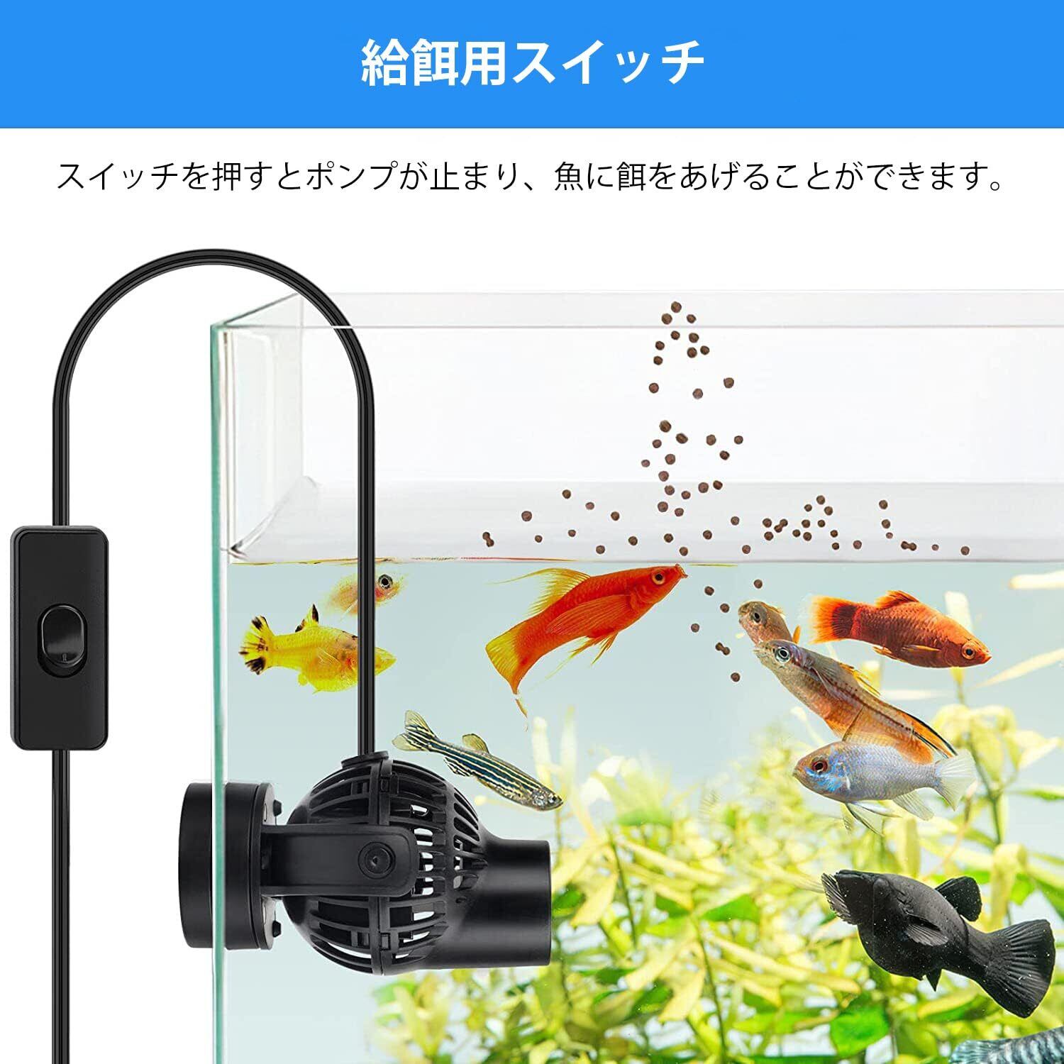 【スイッチ付き】餌付け用のスイッチを付けました。 スイッチを押すだけでポンプが止まります。餌を周囲に飛び散らせることなく魚に餌を与えるために便利な機能です。 魚たちに穏やかな餌やりの時間を楽しんでもらいましょう。