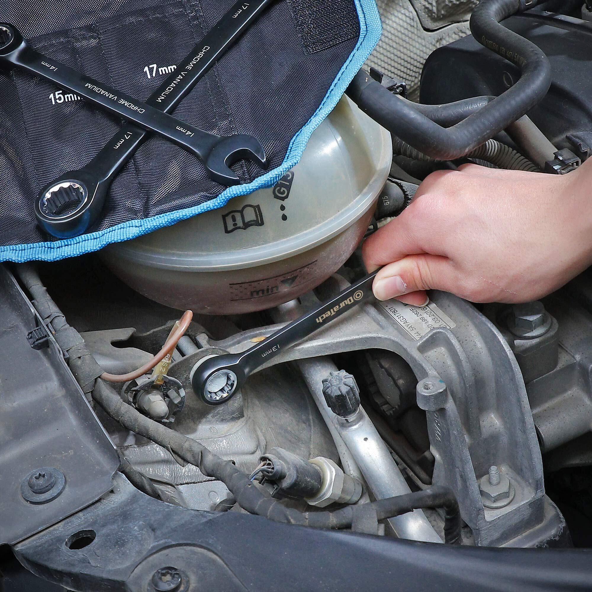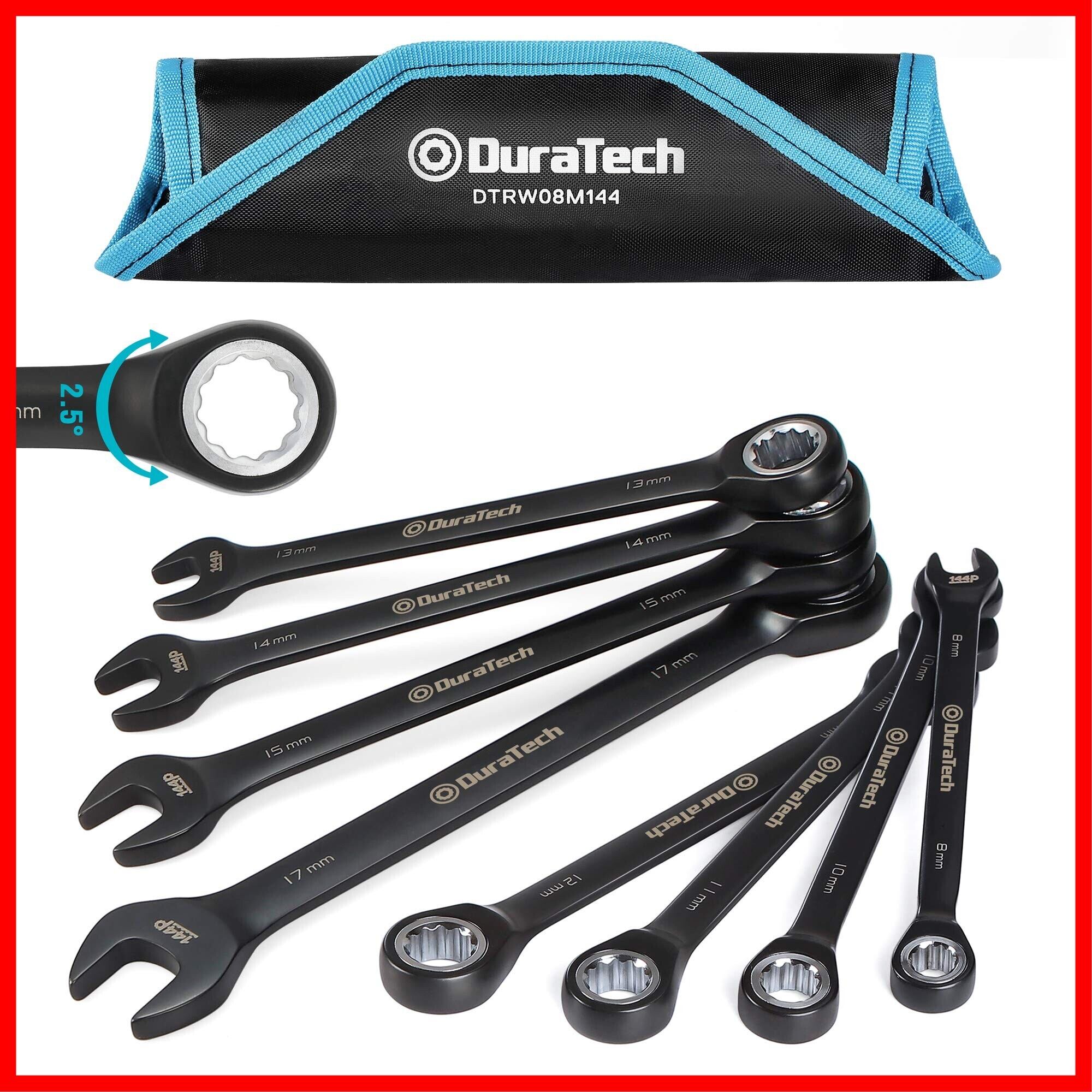 DURATECH コンビネーションレンチ ラチェットレンチセット 板ラチェット スパナ 144ギア 8~17mm CR-V製 黒クロムメッキ済 組み立て DIY 収納袋付 8本組