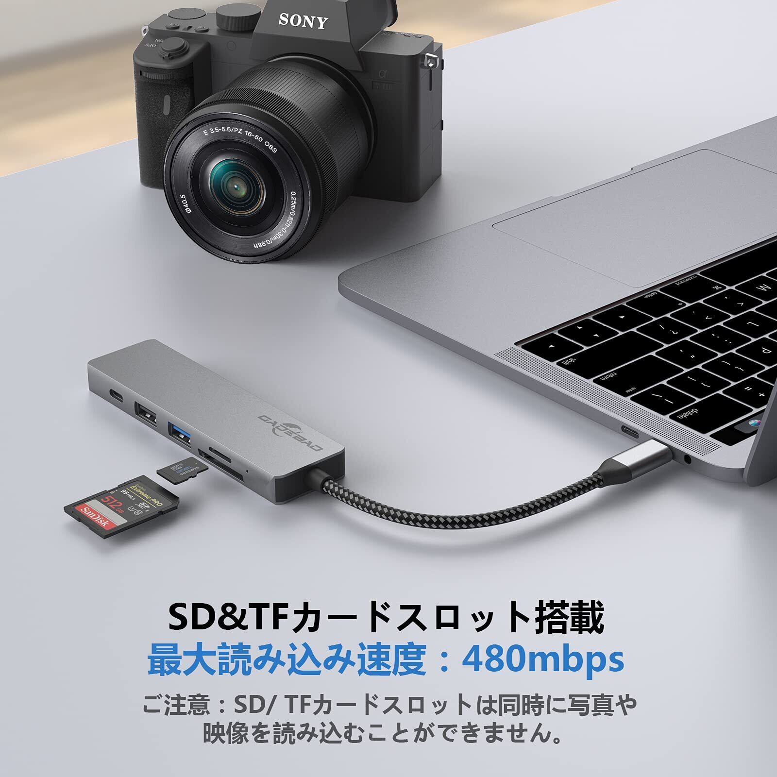 『高速データ転送』:USB3.0/2.0ポートが付属しますので、最大5Gbpsの伝送速度をサポートし、データとHD動画を数秒で転送できます;外付けUディスク、マウス、キーボードなど複数のUSB機器が同時に接続可能。SDカードとTFカードのスロットを搭載し、最大読み込み速度は480mbpsです、動画やデータのスムーズな伝送を実現可能です。ご注意:SD/ TFカードスロットは同時に読む込不可です。