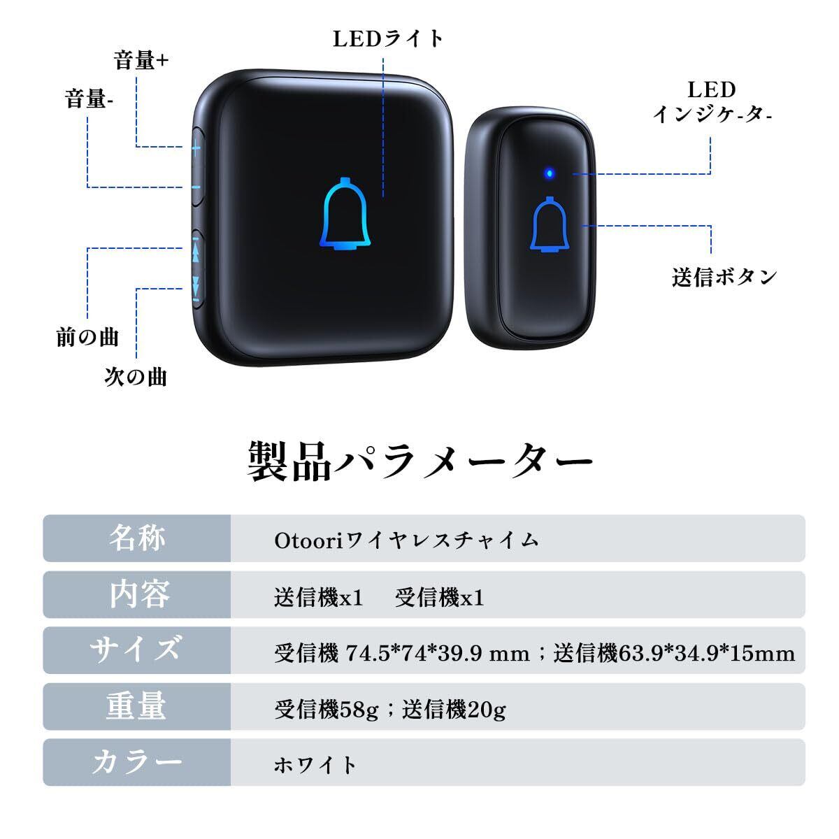 Otoori ワイヤレスチャイム 玄関チャイム IP66防水防塵 送信機電池式 受信機コンセント 300M無線範囲 配線不要 取付簡単 7段階音量調節 メモリ機能 60種以上メロディー 音と光で呼び出し LED提示 増設可能 インターホン(黒 1送信機 1受信機)