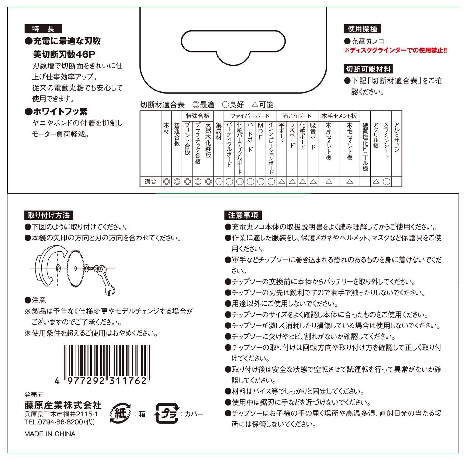 用途:充電丸鋸や電動丸鋸に取り付けて木材、合板、集成材などの切断作業