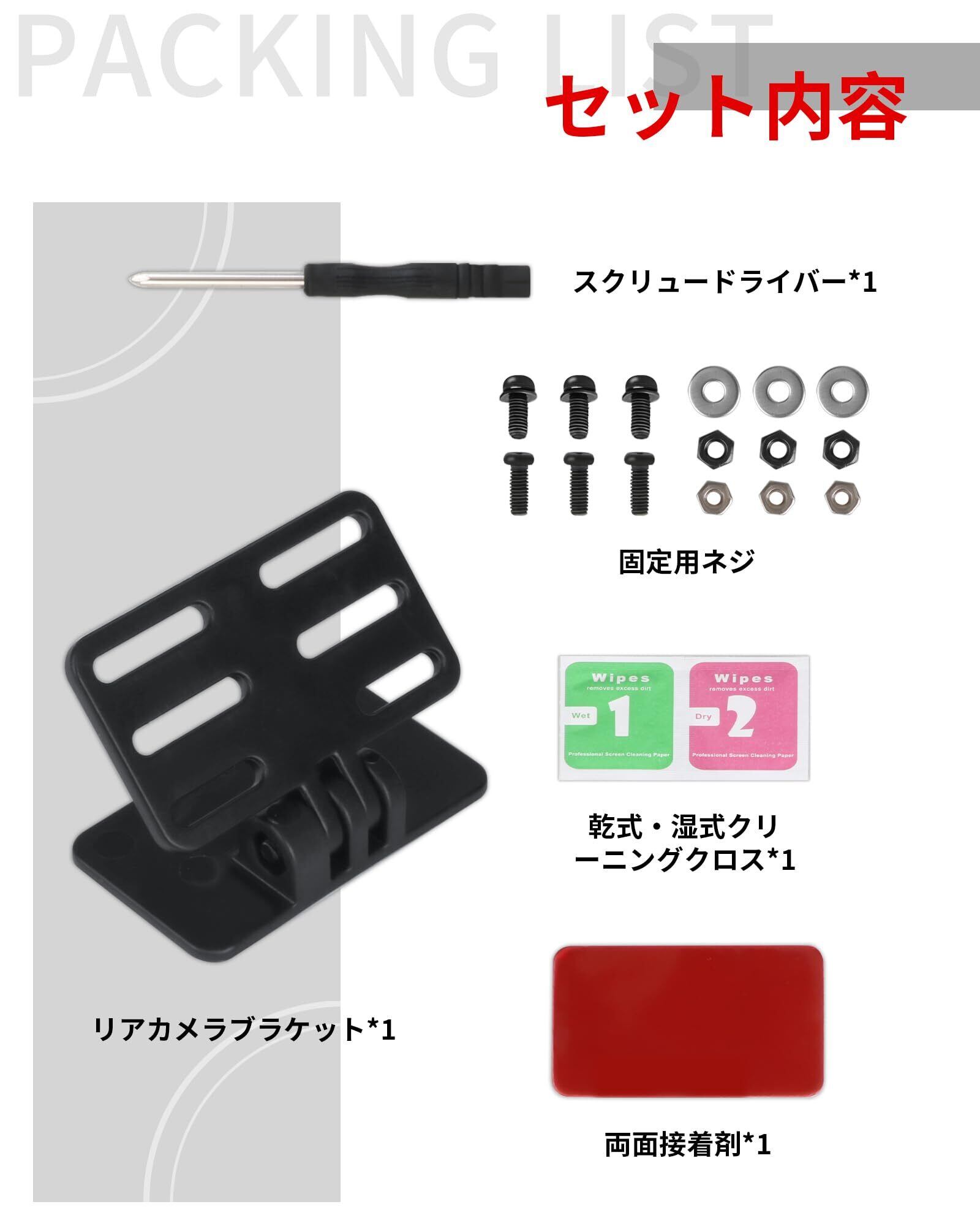 両面テープと取り付け工具付き:両面テープ付きのため、リアカメラをブラケットに固定した後、取り付けたい位置に貼り付けてください。角度を幅広く調整できます。