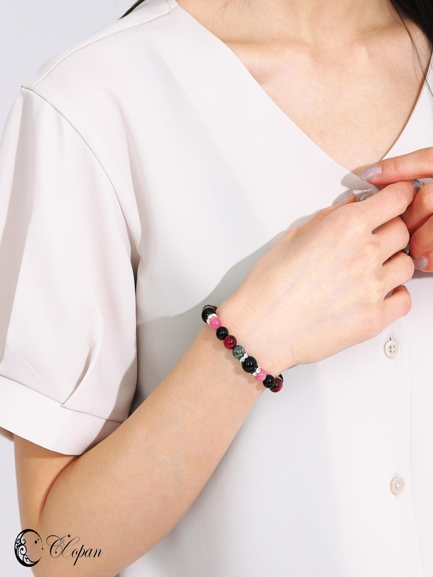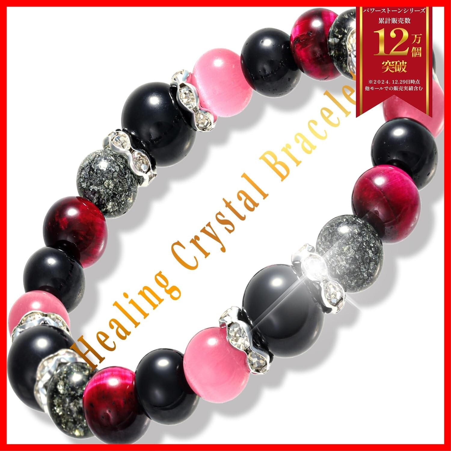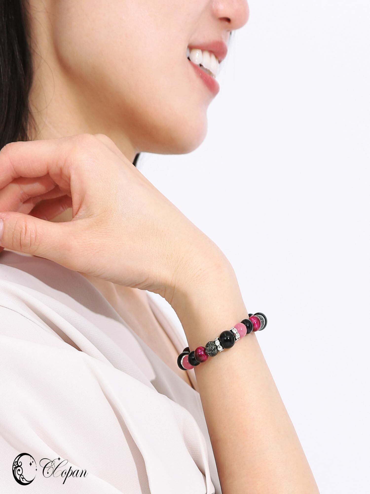【幸運を引き寄せるブレスレットの組み合わせ】クラック水晶、ピンクタイガーアイ、ピンクジェード、ブラックオニキスを組み合わせたブレスレットは、金運、健康運、人間関係、幸運をトータルでサポート。美しいデザインと実用性を兼ね備えたアクセサリーです