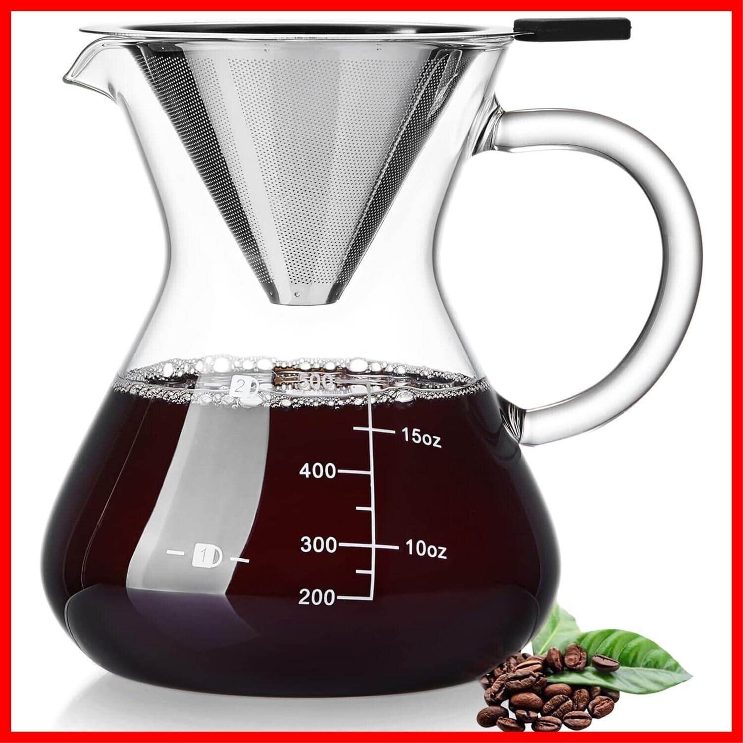 特徴 耐熱ガラス/直火対応, 便携式, 目盛付き, 高品質ステンレスフィルター付き-2層メッシュ, ペーパーレス