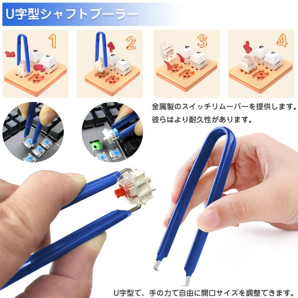 セット内容:4点セット(キープーラー1個、U字型シャフトプーラー1個、潤滑ペン1本 、4本爪ホルダー1個)初めてキーボードを作る人も、メカニカルキーボードのファンも、これらを使ってキーボードをカスタマイズしてみてはいかがでしょうか。