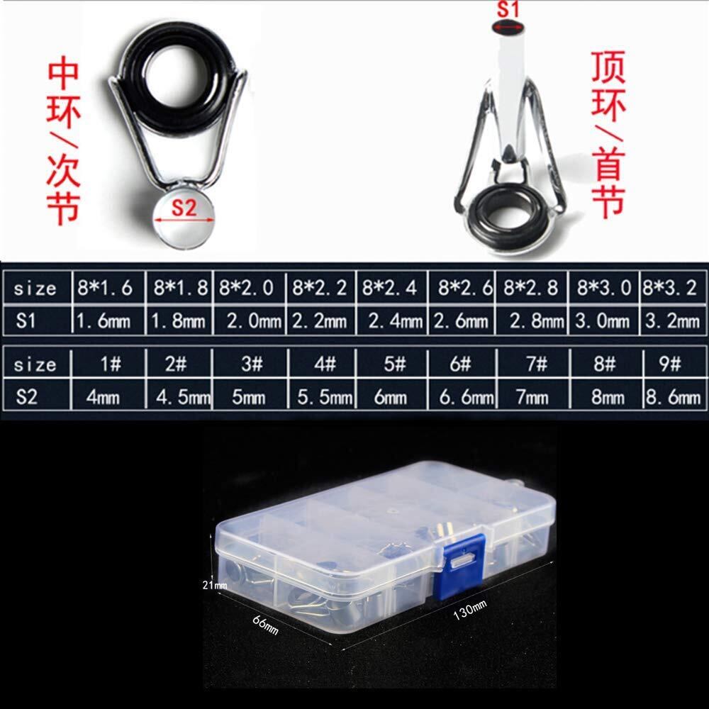商品内容:36個 釣竿ガイドセット。トップリングの各モデルに2つ+ミドルリングの各モデルに2つ。寸法表を参照してください。