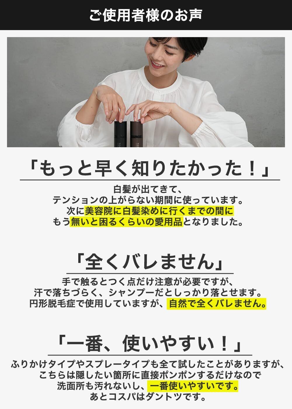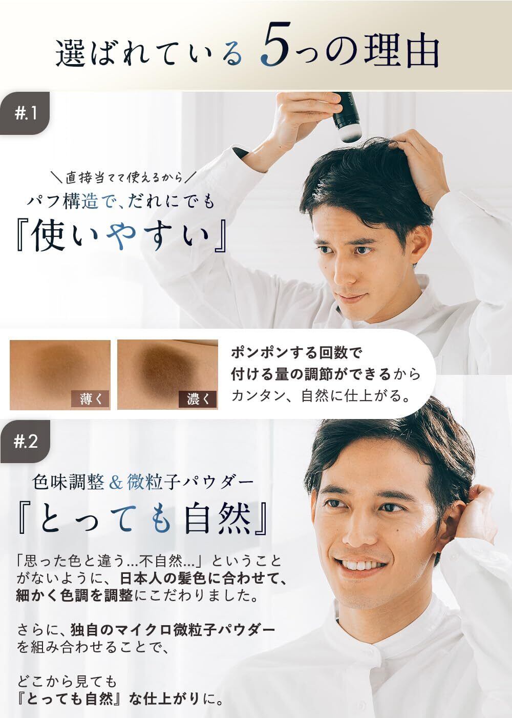【こんな方にオススメ】白髪にお悩みの方(毛染め前後の根元白髪、横分けにした際に目立つ白髪に)、薄毛にお悩みの方(軽度な頭皮の透け、ボリューム不足)円形脱毛症にお悩みの方。