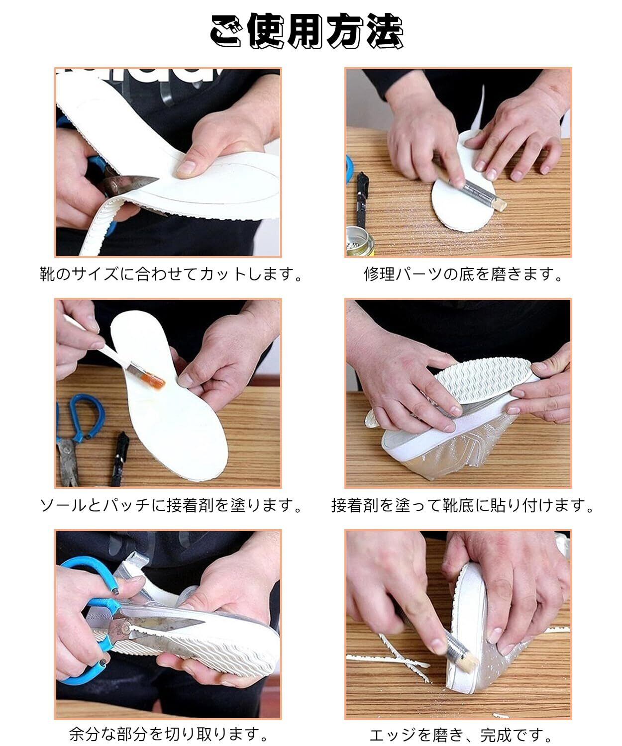 自由に切り貼り可能:好みのサイズと配置に応じて自由にカットして使用することができるため、革靴やスポーツシューズなどさまざまな種類の靴底に対応可能です。