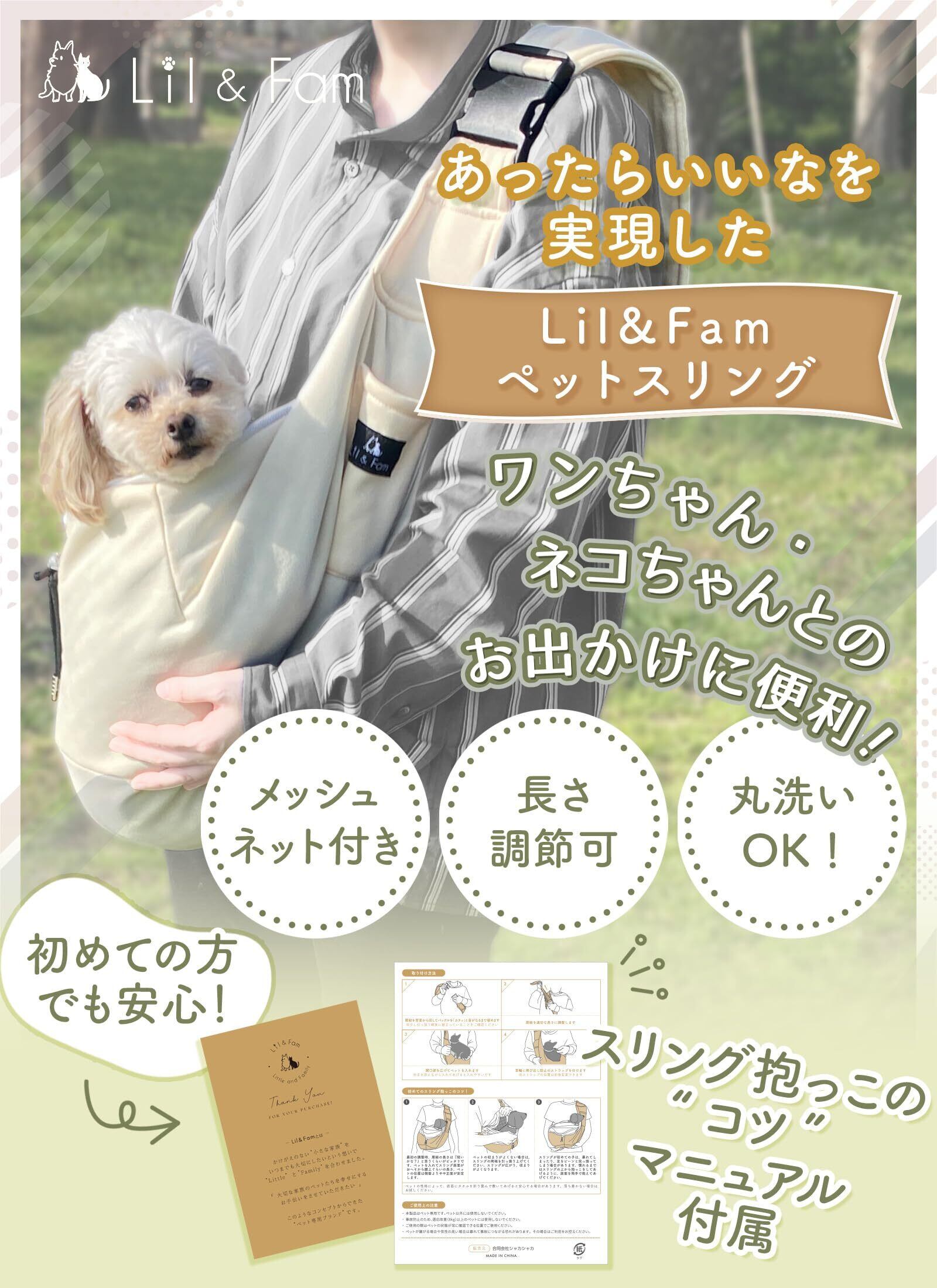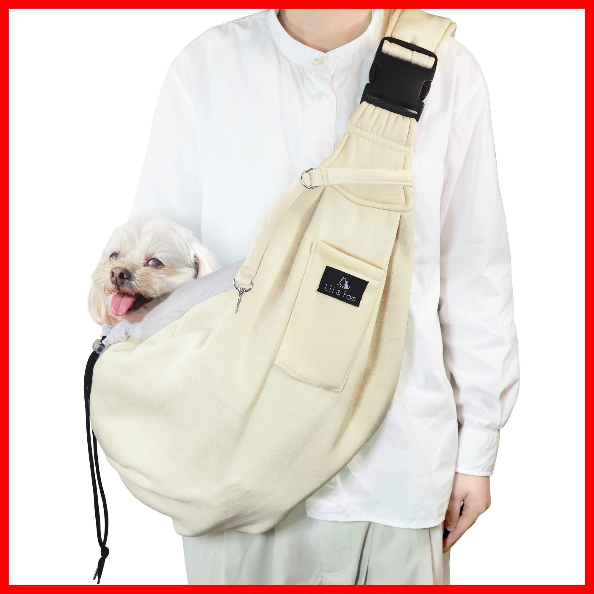 Lil&Fam ペットスリング 犬 抱っこ紐 キャリーバッグ ペットバッグ 飛び出し防止 メッシュネット付き 長さ調節可能 猫 キャリー (オフホワイト)