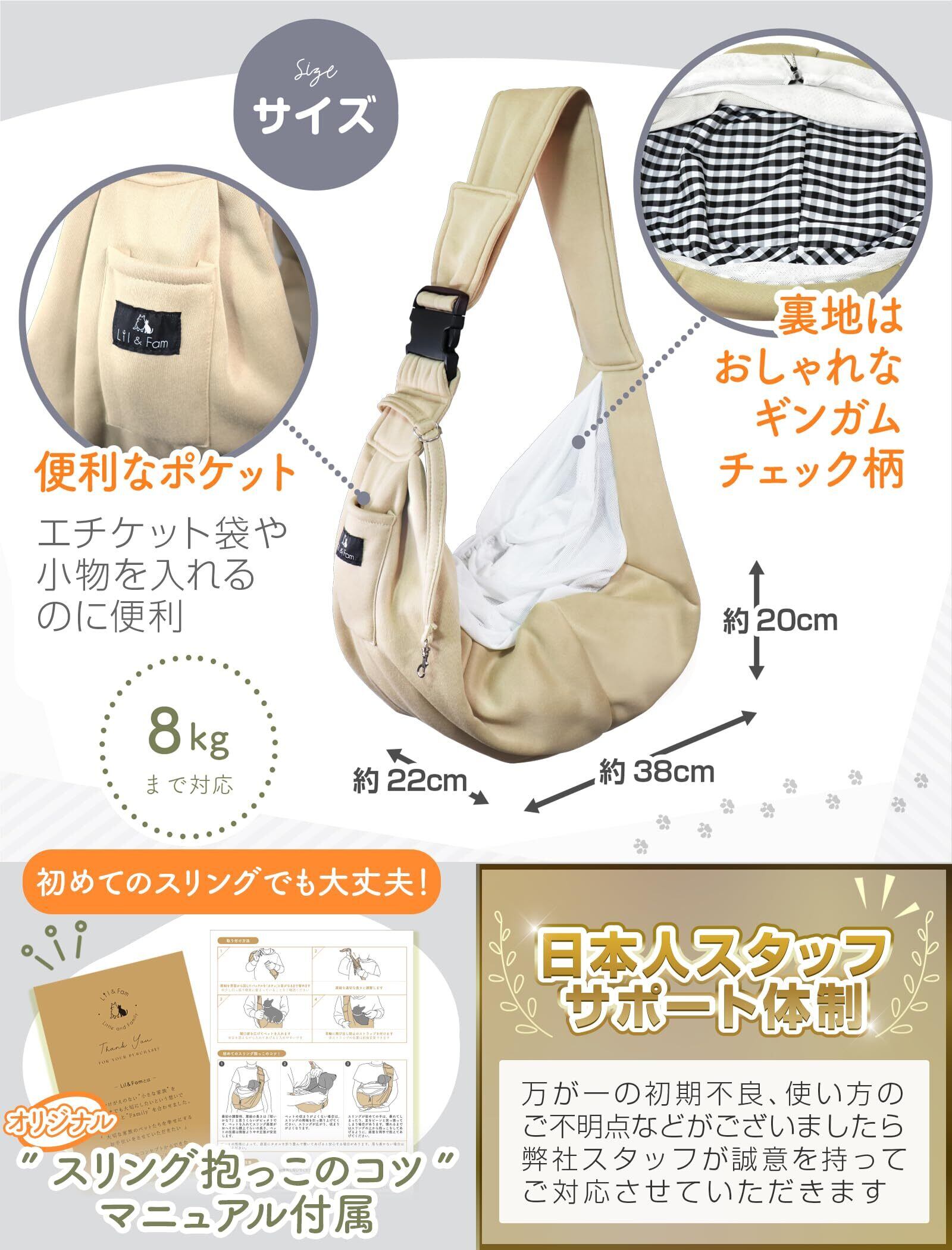 【気軽に使えるペットスリング】肌触りのいいポリエステル素材で軽量&コンパクトだから持ち運びにとっても便利です。飼い主さんの体温が伝わるから甘えん坊のペットも安心!推奨体重8kg以内の小型犬、中型犬、猫、小動物(ウサギなど)に対応可能なペットバッグです。