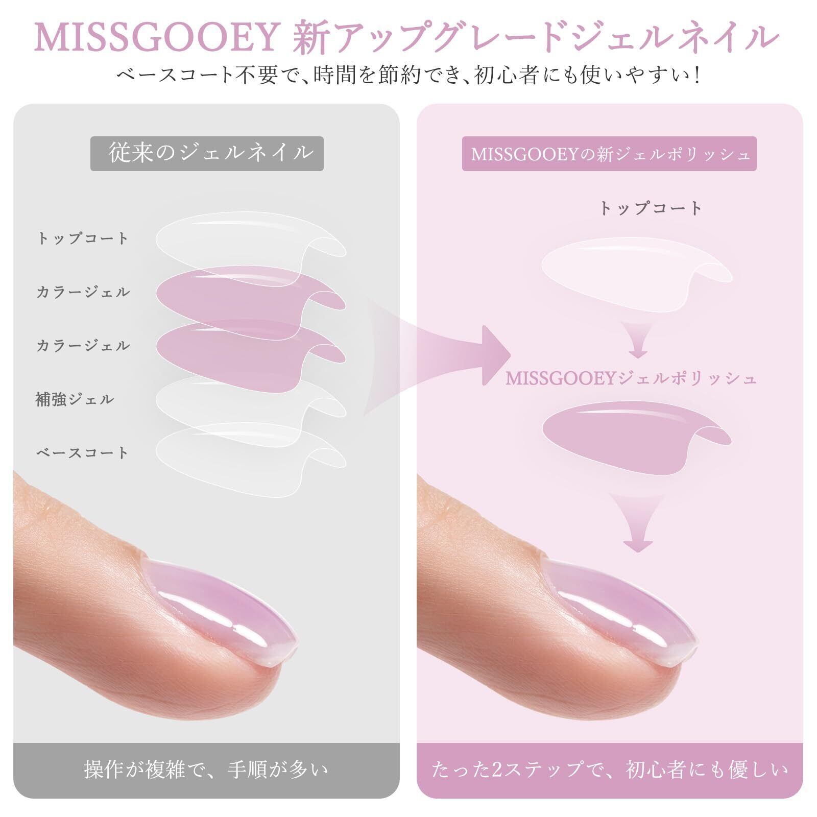 【新しいネイルフォーミュレーション】Missgooeyのカラージェルは、改良された素材で作られており、爪に優しいだけでなく、傷んだ爪もケアします。無毒で不快な臭いがありません。快適なネイルDIY体験を提供します。