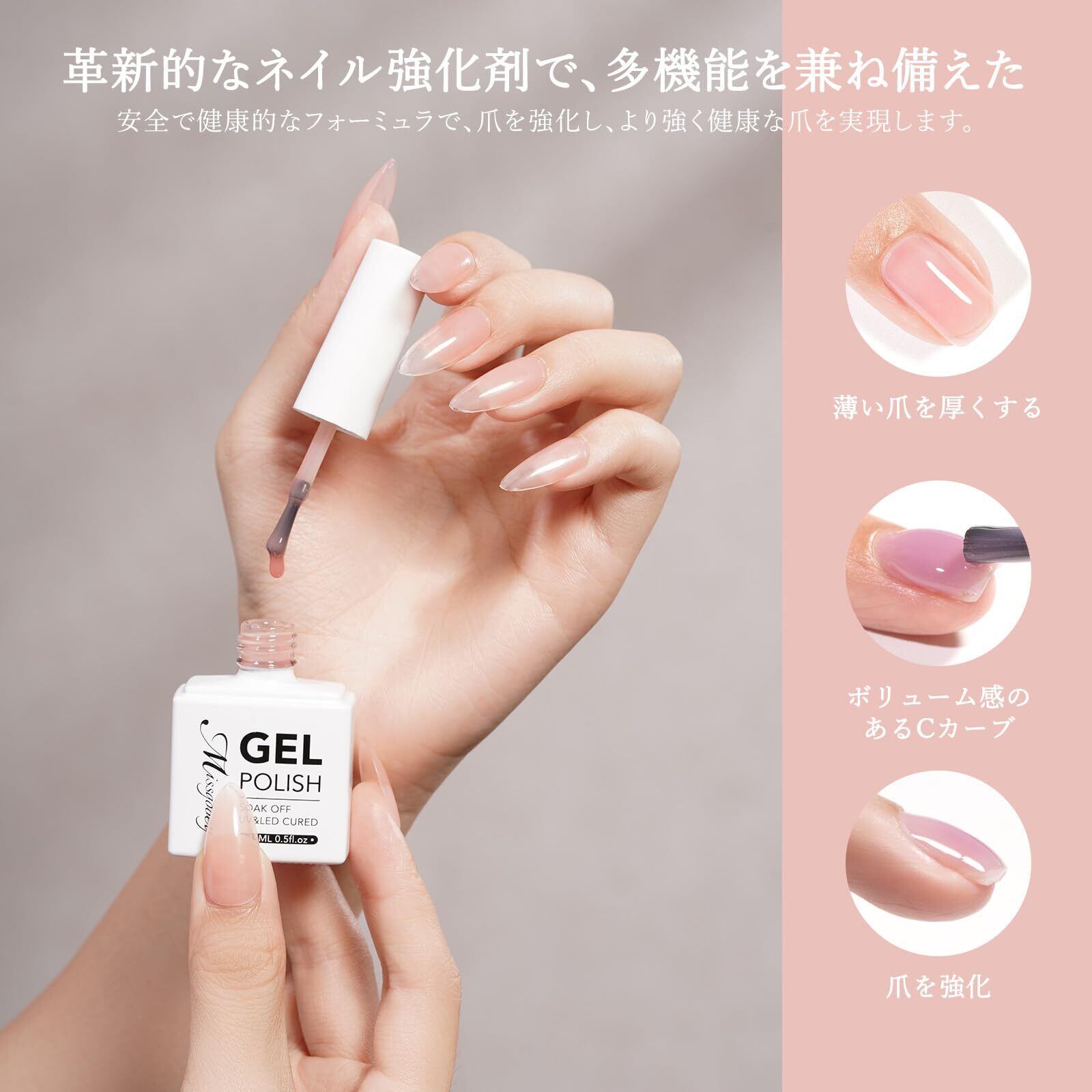【MISSGOOEY多機能ジェルネイルが登場!】本製品はベースジェルが不要で、MISSGOOEYの多機能ジェルネイルを1~2層塗り、最後にトップコートを仕上げるだけで、長持ちし、ふっくらとした美しいネイルが簡単に完成します。本製品はビルダージェルや補強ジェルとしても使用可能で、特に柔らかい爪や平らな爪の方に最適です。