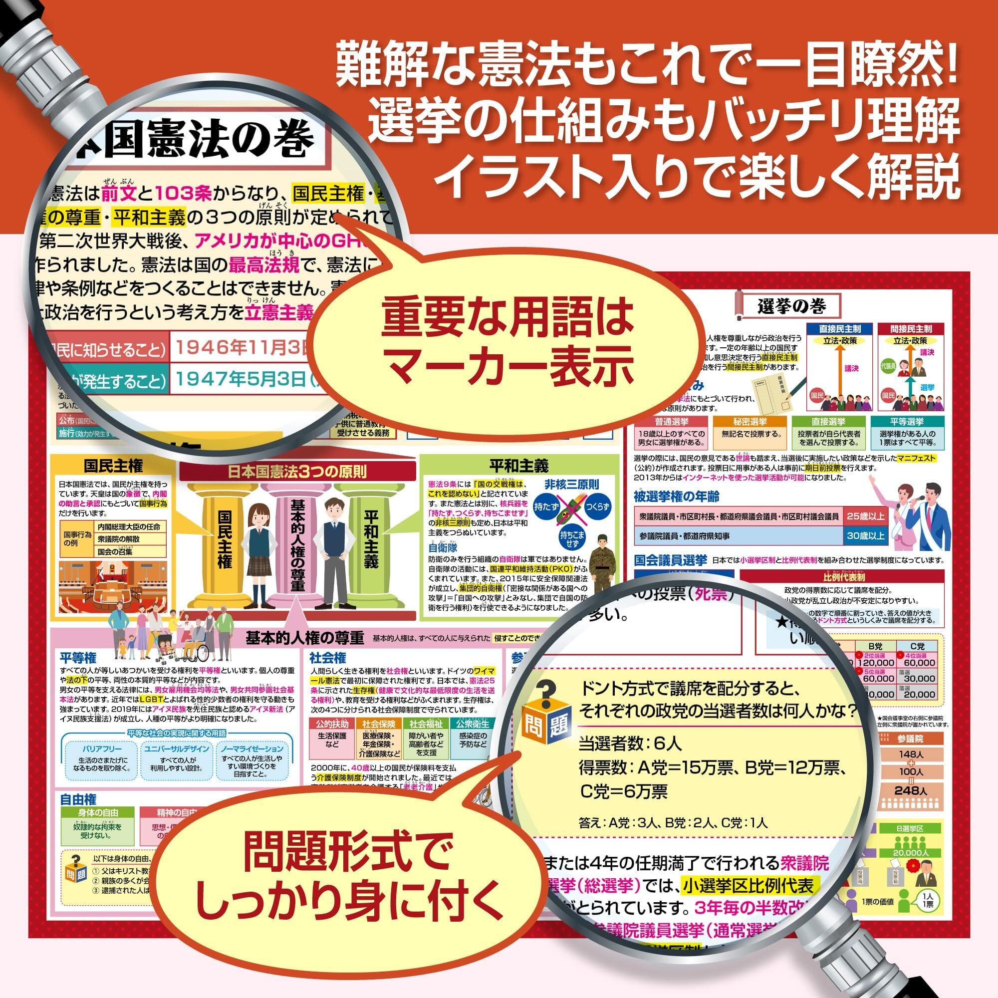 日本国憲法の基本理解をサポート:日本国憲法の3つの原則(国民主権、基本的人権の尊重、平和主義)や憲法改正の手続きなどをわかりやすく解説。中学受験における憲法の基礎をしっかりと理解できるよう工夫されています。視覚的にわかりやすいデザインで重要な情報を一目で把握でき、試験対策にも最適です。