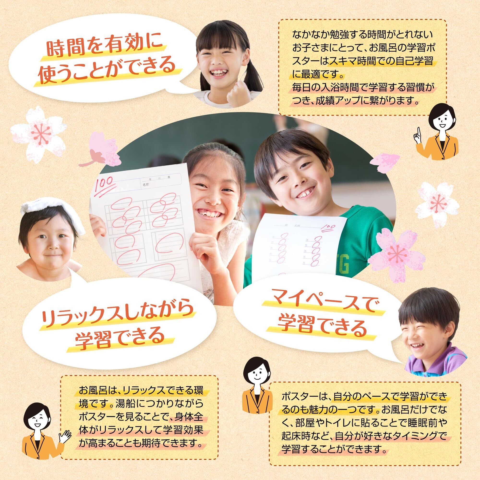 防水性と耐久性::ポスターは防水加工が施されており、お風呂場でも安心して使用できます。湿気や水滴に強く、長期間にわたって使用可能です。入浴時間を有効活用し、リラックスしながら学習できるため、勉強に対するストレスを軽減し、学習効果を高めます。日常生活に溶け込むデザインで、視覚的に楽しみながら知識を吸収できます。