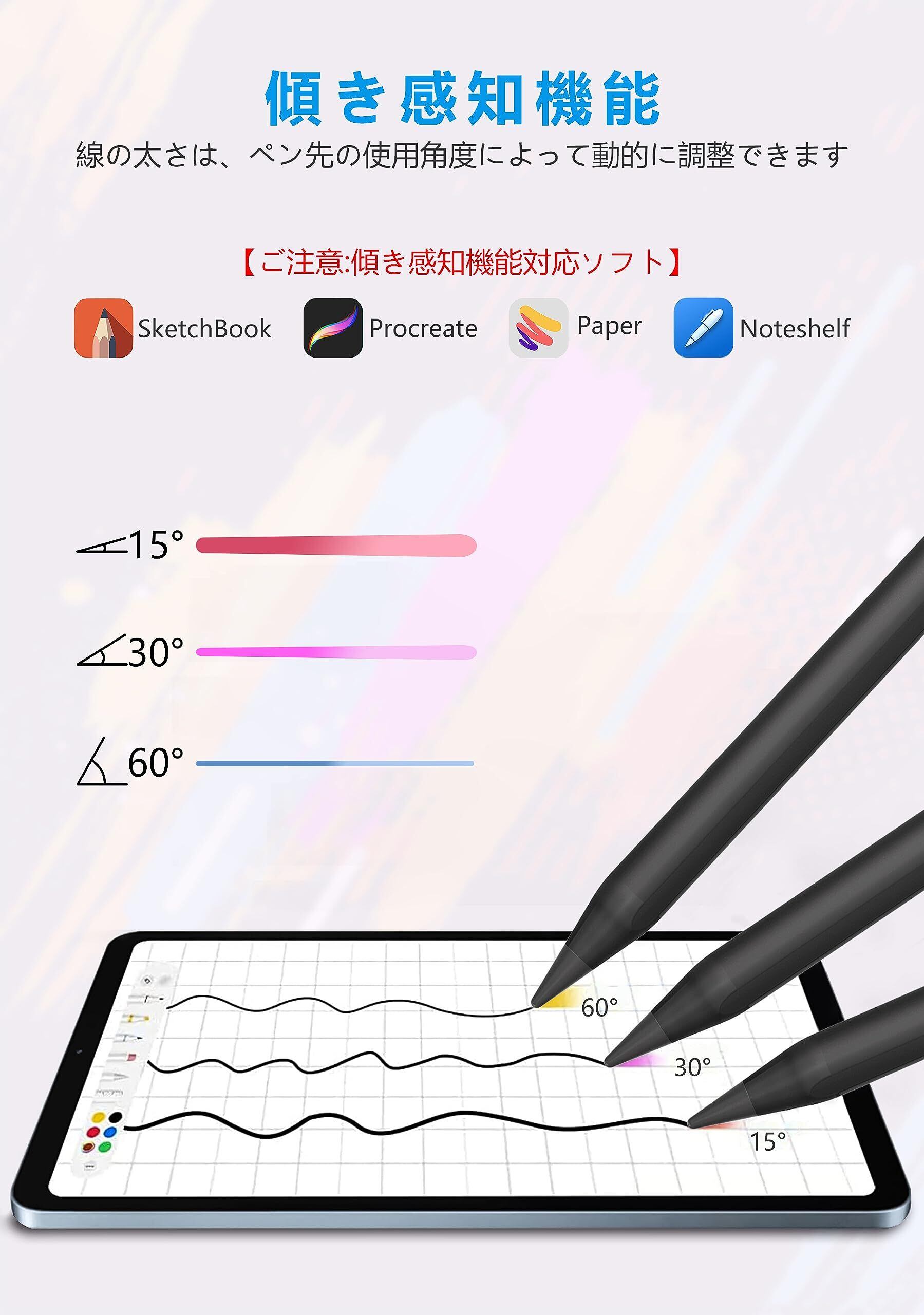 【傾きを感知機能 /超高精度/改良型ペン先】iPadタッチペンは、傾きを感知できるので、ピクセルレベルの精密さを持ちながら、従来の鉛筆のように線の太さを変えるのも、アーティスティックな効果をいろいろ加えるのも思いのままです。絵描き最適!ペン先はApple Pencilと同じ高品質POM素材を使用、Apple pencil(1/2)互換性があり。(ご注意:傾き感知機能対応ソフト:SketchBook、Procreate、Paper、Noteshelf、Artset )