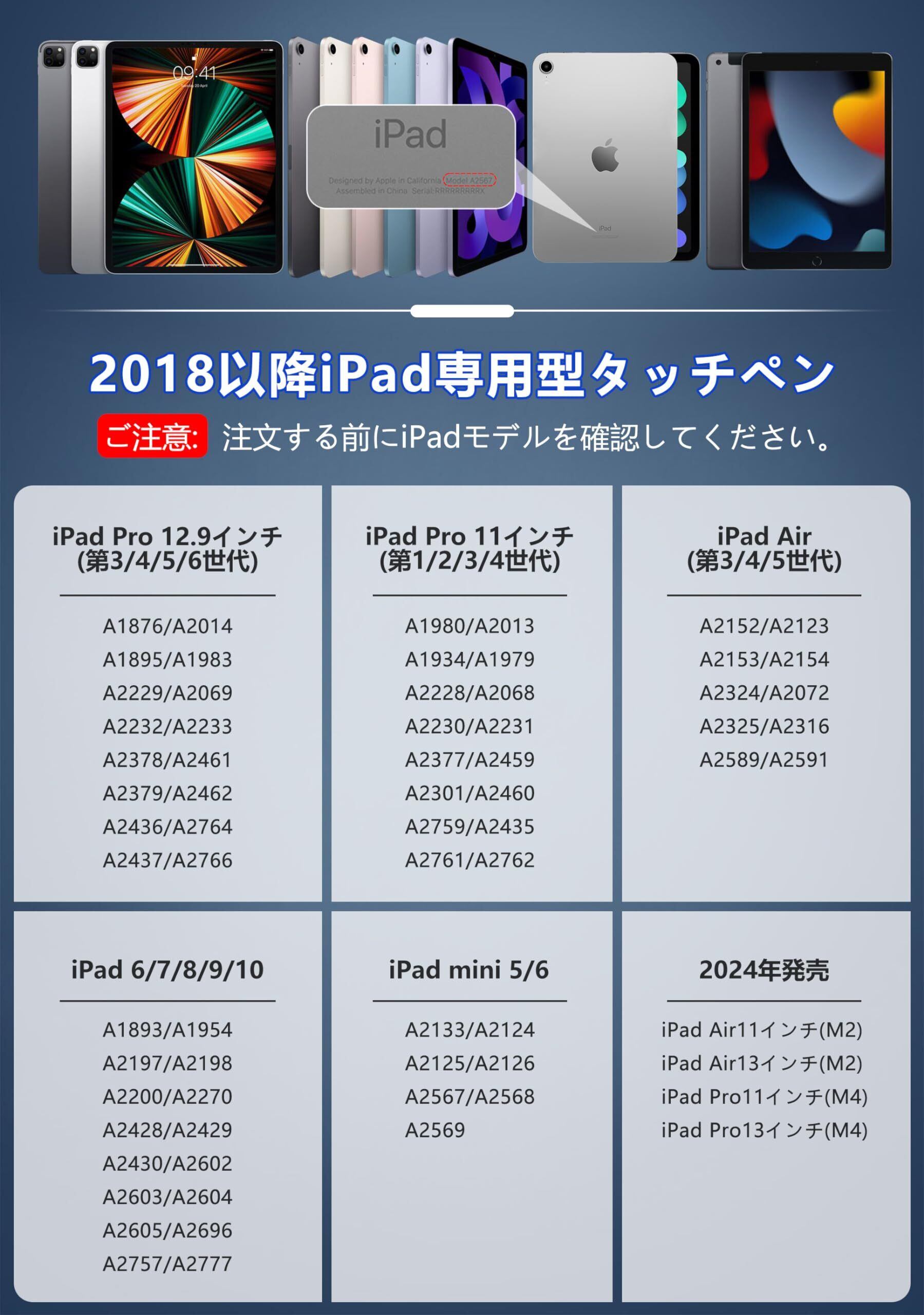【2018年以降のiPad専用ペン】対応機種:iPad (第6/7/8/9/10世代)、iPad Pro 12.9インチ (第3/4/5/6世代) 、 iPad Pro 11インチ(全ての世代)、iPad Air (第3/4/5世代) 、iPad mini (第5/6世代)、iPad Air 11/13インチ(M2)、iPad Pro 11/13インチ(M4) 。製品に関して何か問題があった場合は、お気軽にご連絡ください。お問い合わせ方法:アカウントサービスの「アカウントサービス」→「注文履歴」→「販売者」→「質問」からお気軽にお問い合わせください。