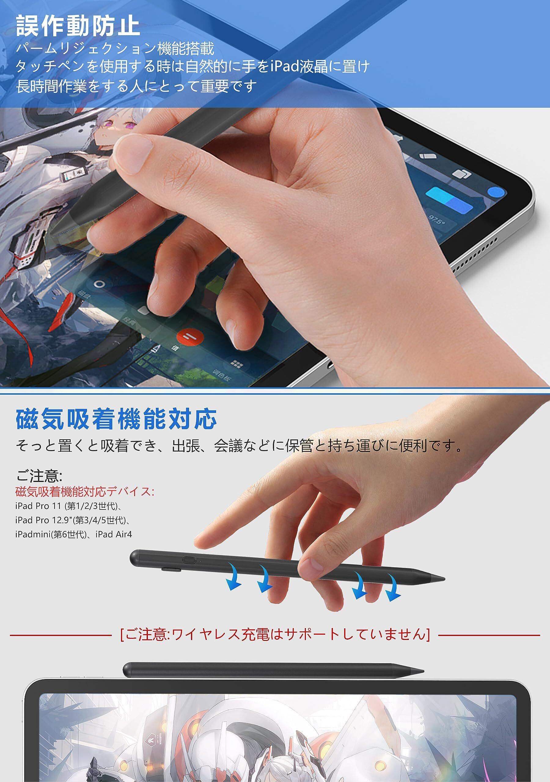 【うっかりタッチ防止&磁気吸着機能】パームリジェクション機能を搭載しており、デバイスの画面に手を置くことができ、より快適で自然な感触を提供します。創作意欲・インスピレーションが妨げられる心配がありません。磁気吸着機能があり、紛失を防ぎ、収納や持ち運びも簡単です。iPad Pro 12.9"、iPad Pro 11"、iPad Air 第4/5世代、iPad mini第6世代など、磁気吸着機能対応デバイスに対応しています。何をする時も驚くほど使いやすく、アイデアが浮かんだ瞬間を逃しません。(注:iPad側面が円弧状のエッジは磁気吸着しにくい可能性があります)