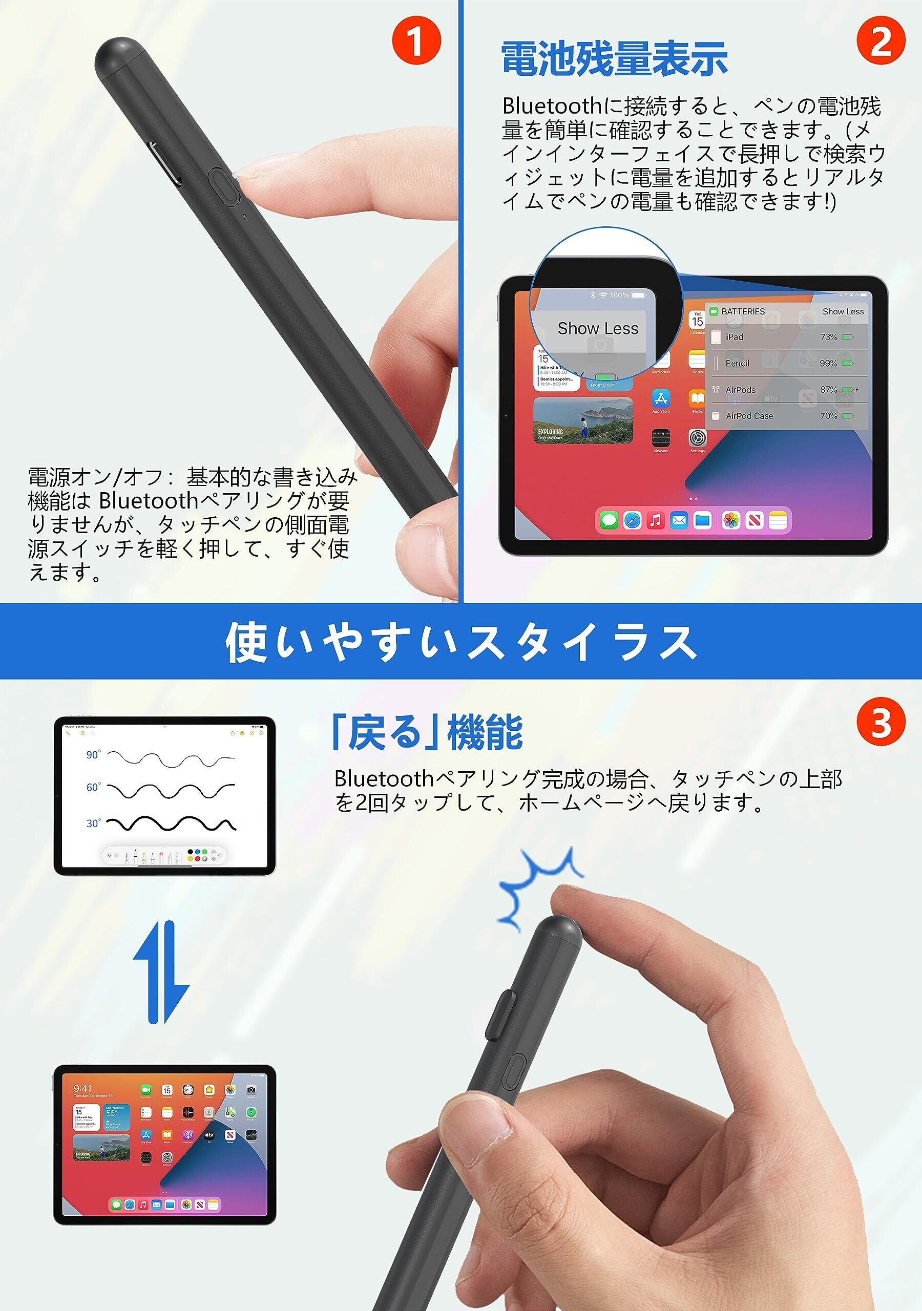 【分かりやすい電池残量&「戻る」機能】電源スイッチを1回タップするだけでデバイスとペアリングできます、Bluetoothに接続すると、ペンの電池残量を一目で確認でき、突然の電池切れの恥ずかしさを回避します。Bluetooth に接続した後、ペンキャップの上部をダブルクリックしてホームページに戻ります。