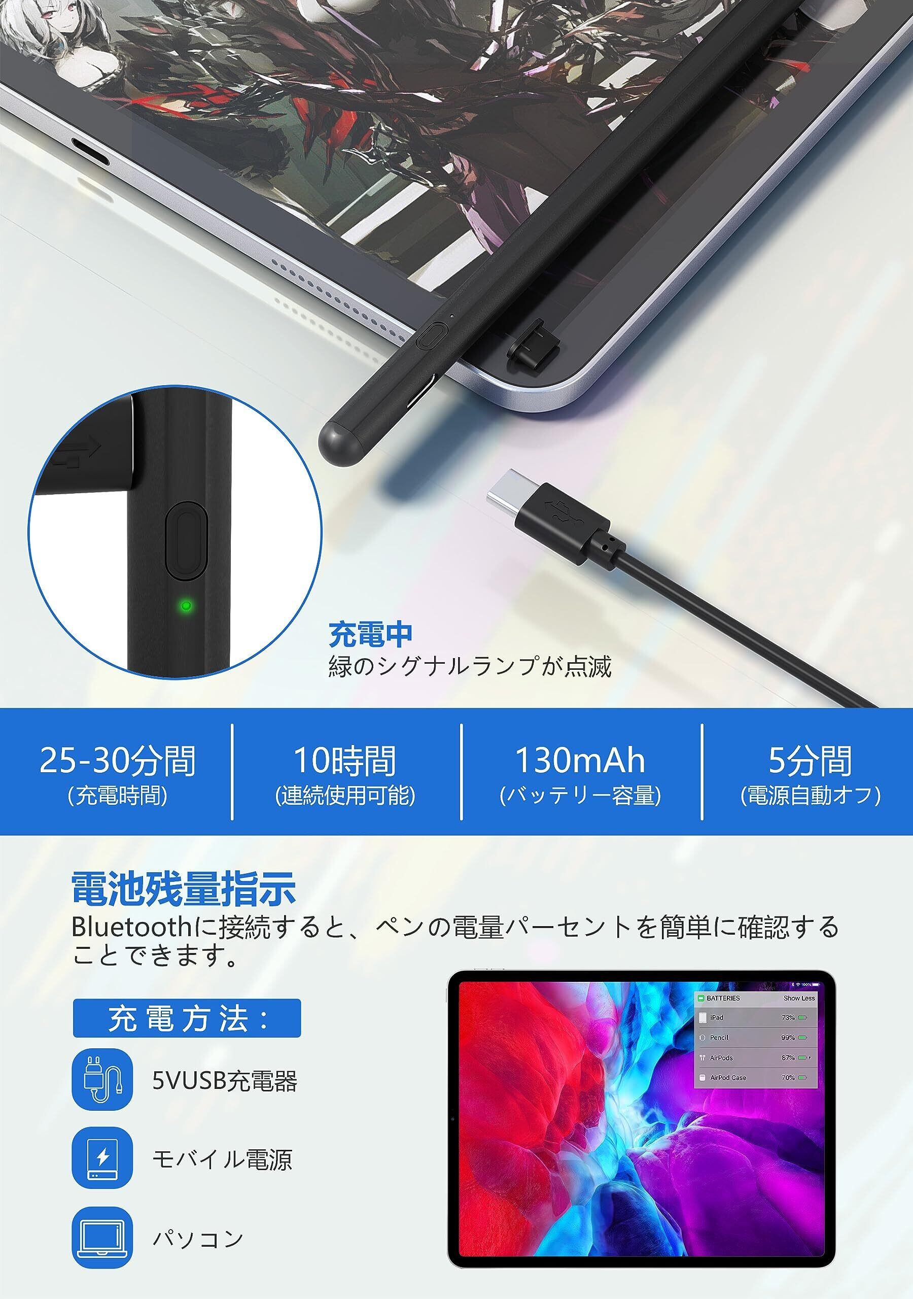 【30min急速充電&長時間使用】30分間フル充電で10時間継続使用可能となります。アップルペンシルは5分間操作が行われない場合、自動的に電源が切れ、電力を節約します。iPad ぺんの電力が 10% 未満であることが判明した場合は、自動シャットダウンを避けるために、USB C ケーブルを接続してスタイラスを充電してください。 充電中は LED ライトが点滅し、完全に充電されると点灯したままになります。Bluetoothに接続すると、iPad スタイラスペンの電量パーセントを簡単に確認することでき、突然の電池切れの恥ずかしさを回避します。