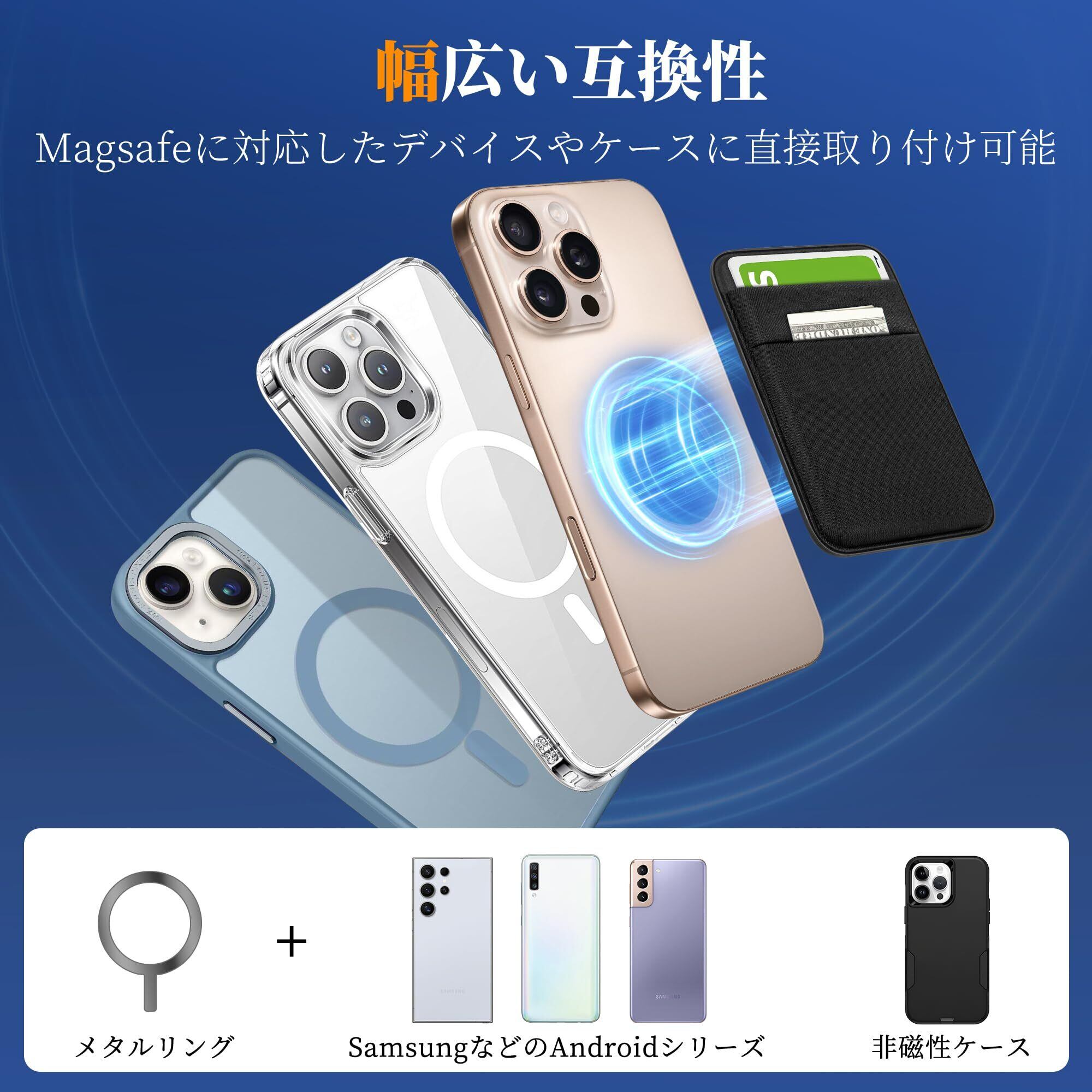 【全機種対応】SHANSHUIのカードケースはiPhone16/15/14/13/12シリーズ、などMagsafe対応のスマホや磁気互換スマホケースにはもちろん、弊社のM-Plateと併用するとSamsung、Sony、HUAWEIなどスマホの全機種に対応します。(M-Plateは本パッケージに含まれておりません。)