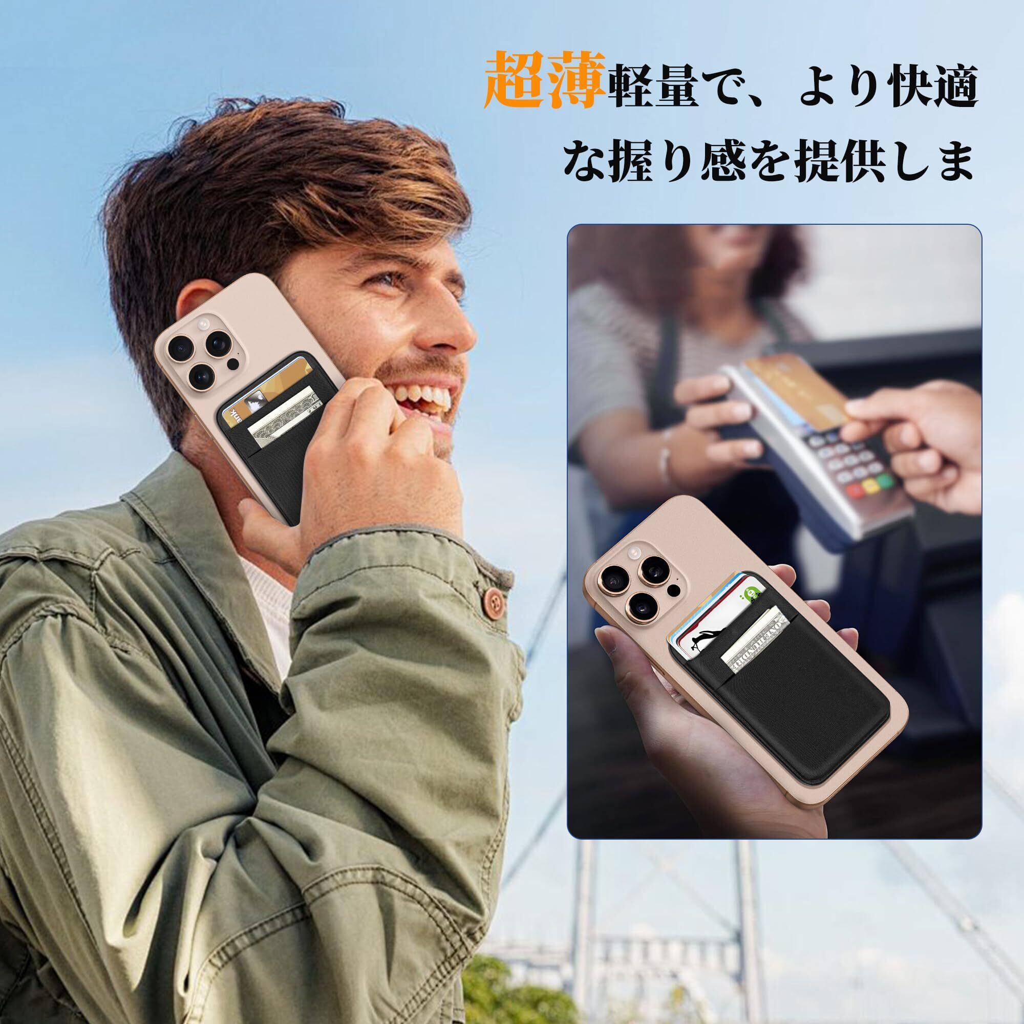 【磁力カードポケット】SHANSHUI携帯カードホルダーは強力な磁力を内蔵したスマホ カードケースでMagsafeケースやマグネットを内蔵してるiPhone16/15、iPhone14、iPhone13 、iPhone 12シリーズのようなスマートフォンをしっかり吸い付いてカード収納を安心して使用できます。5Nまで引っ張りに最大限耐えることができます。