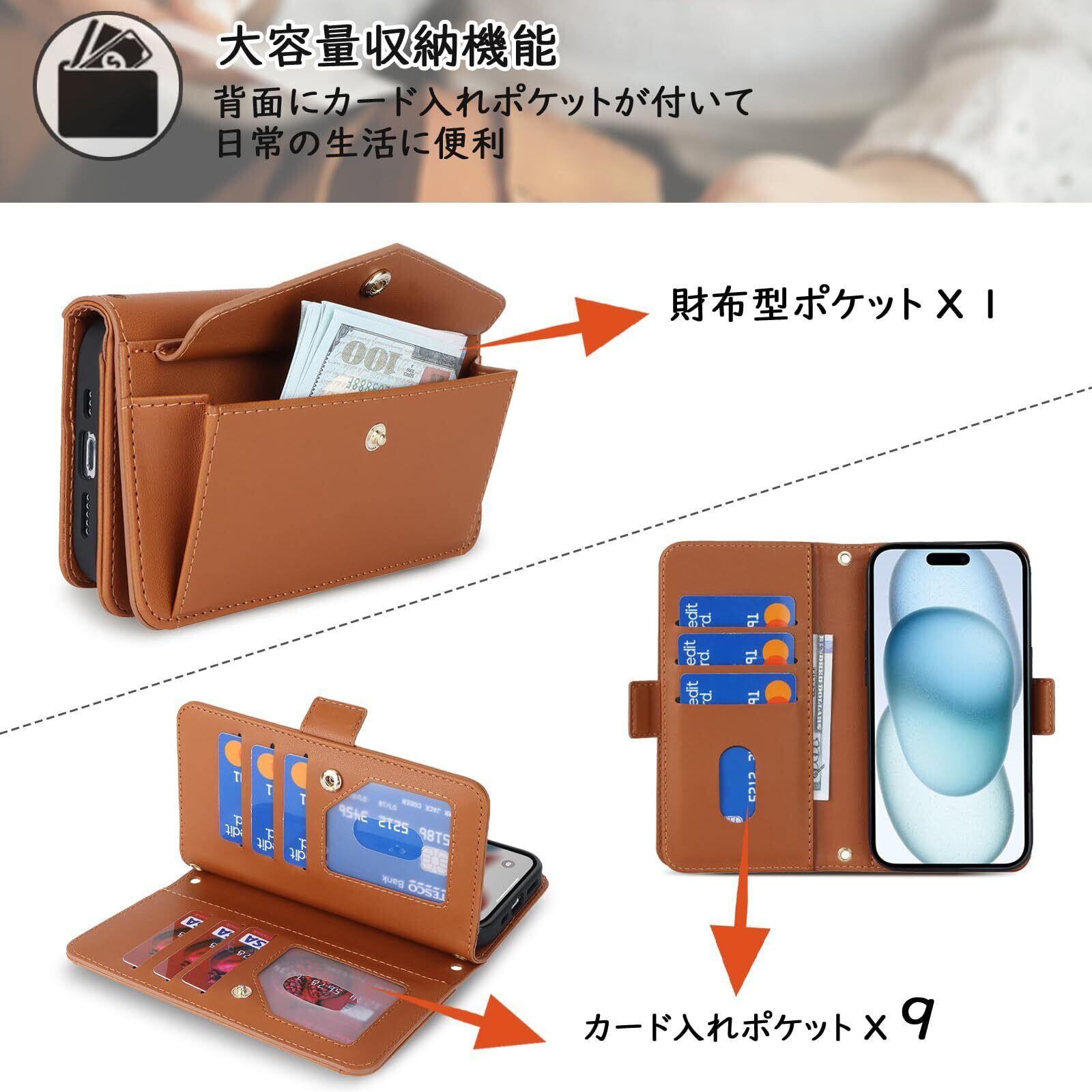 Hamany iphone15 ケース ショルダータイプ いphone15 ケース 手帳型 カード収納 大容量 アイフォン15 ケース スタンド機能 財布型 耐衝撃 全面保護 いphone15 ケース ショルダー 肩掛け 斜めかけ カバー -ライトブラウン