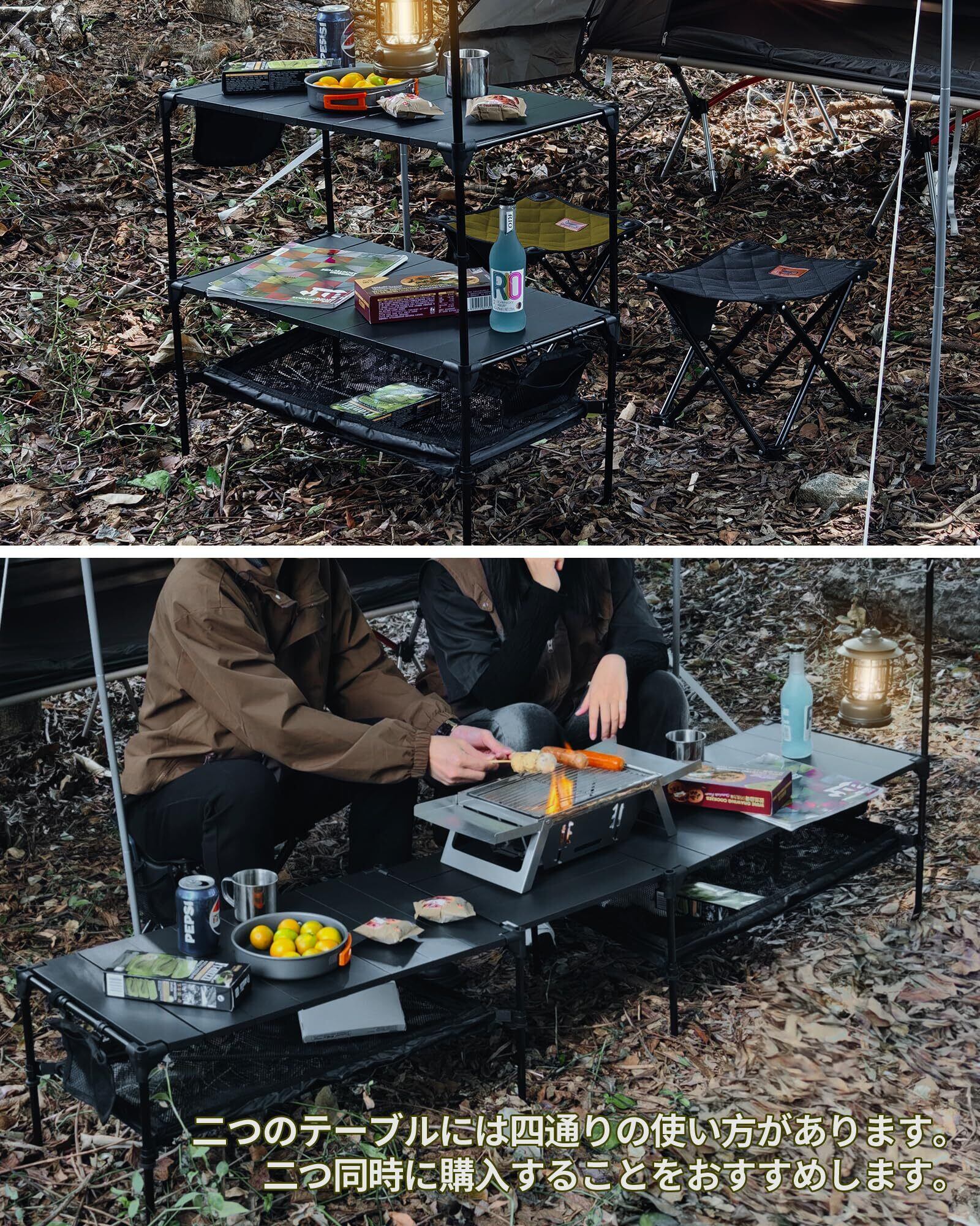 【無限拡大&連結可能】➊同じサイズの二つテーブルを重ねると、二段ラックになります。キャンプ以外、フリーマーケットなどで商品展示用の台としても使えます!➋連結天板と一緒に連結すると、広いローテーブルに変身出来ます。大人数のアウトドア活動にも対応できます。➌大型キャンプイベントがあっても、テーブルと天板を増やせば延長し続けられる。アウトドア活動のキャンプ・ハイキング・BBQなどに適用しており、室内で使用しても違和感なく、上品な金属の質感でお部屋をおしゃれで可愛くします。