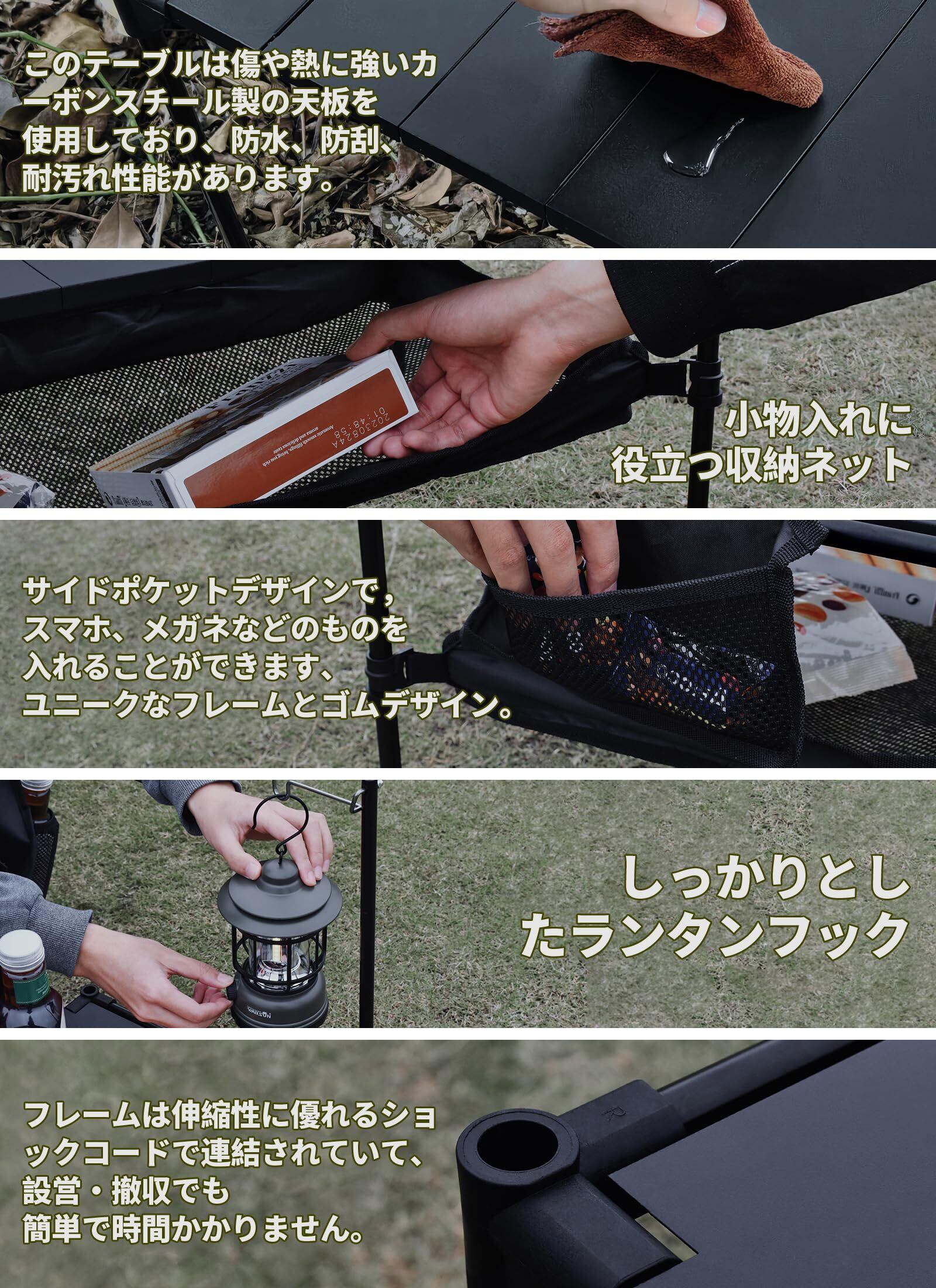 【目を引くディテール】:◆【傷・熱に強いカーボンスチール製天板】焚火台から火の粉が飛んでも傷付きにくく、アウトドアに最適。◆【小物入れに役立つ収納ネット】テーブル下収納として便利なネット棚。小物や食器など、使いたいときにすぐ取り出せます。◆【サイドポケット】スマホ、メガネなどのものを入れることができます。◆【ランタンスタンド】ランタンやランプを吊るして周囲を明るく照らせるランタンスタンド付き。夜間のキャンプでも快適に過ごせます。
