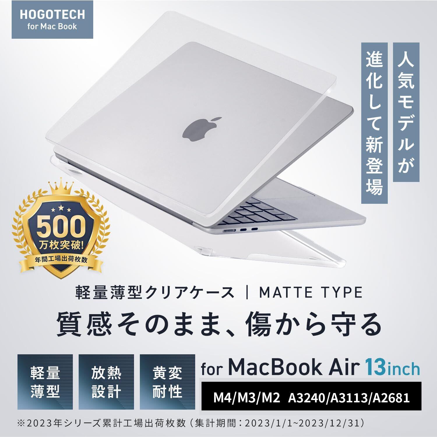 2025 M4対応【質感そのまま、傷を守る】MacBook Air 13インチ M3 / M2 ケース 2024 2022 カバー クリアマットカバー A3240 A3113 A2681 HOGOTECH